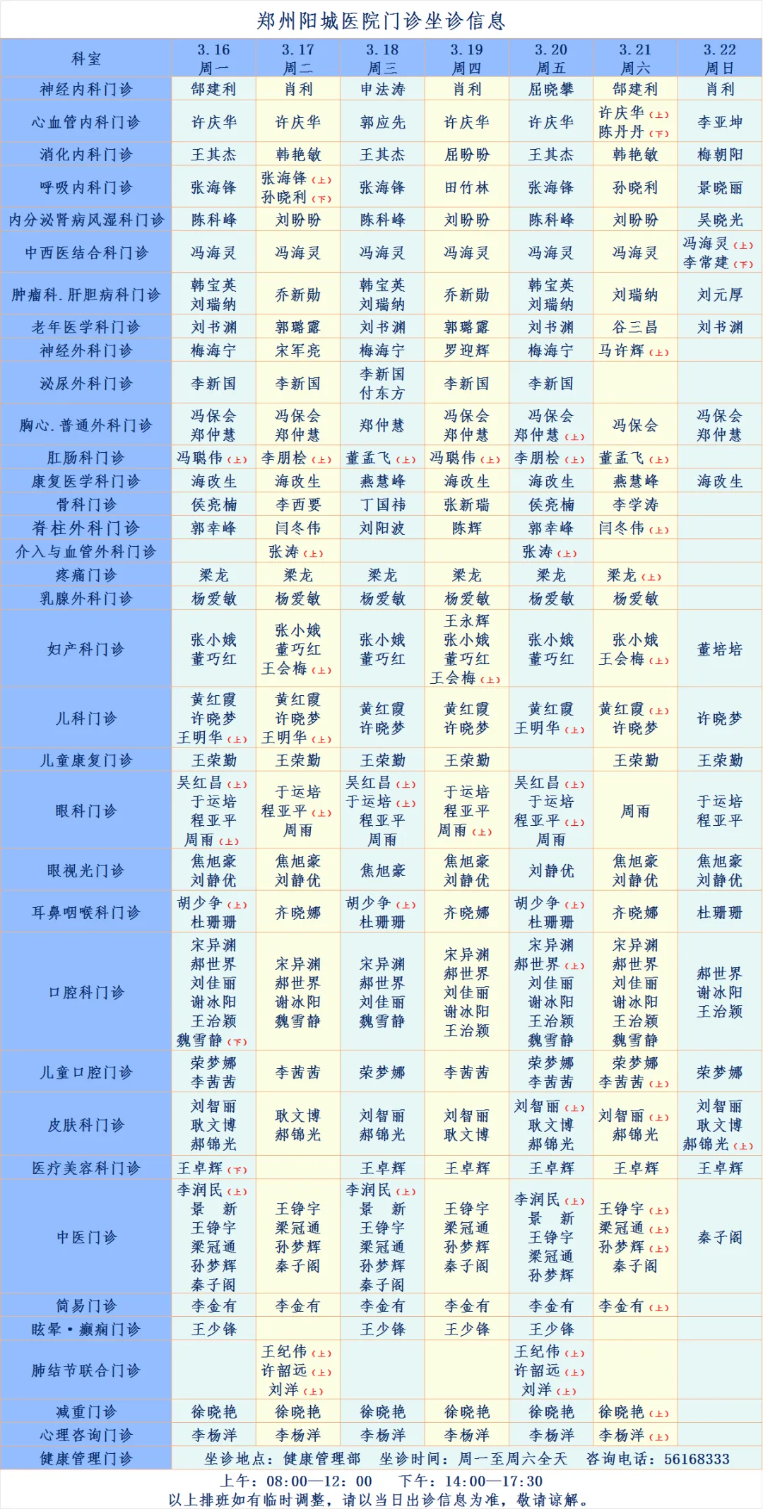 【名医有约】3月16日—3月22日郑州阳城医院特邀省市级专家及本院医生坐诊信息,请查收!