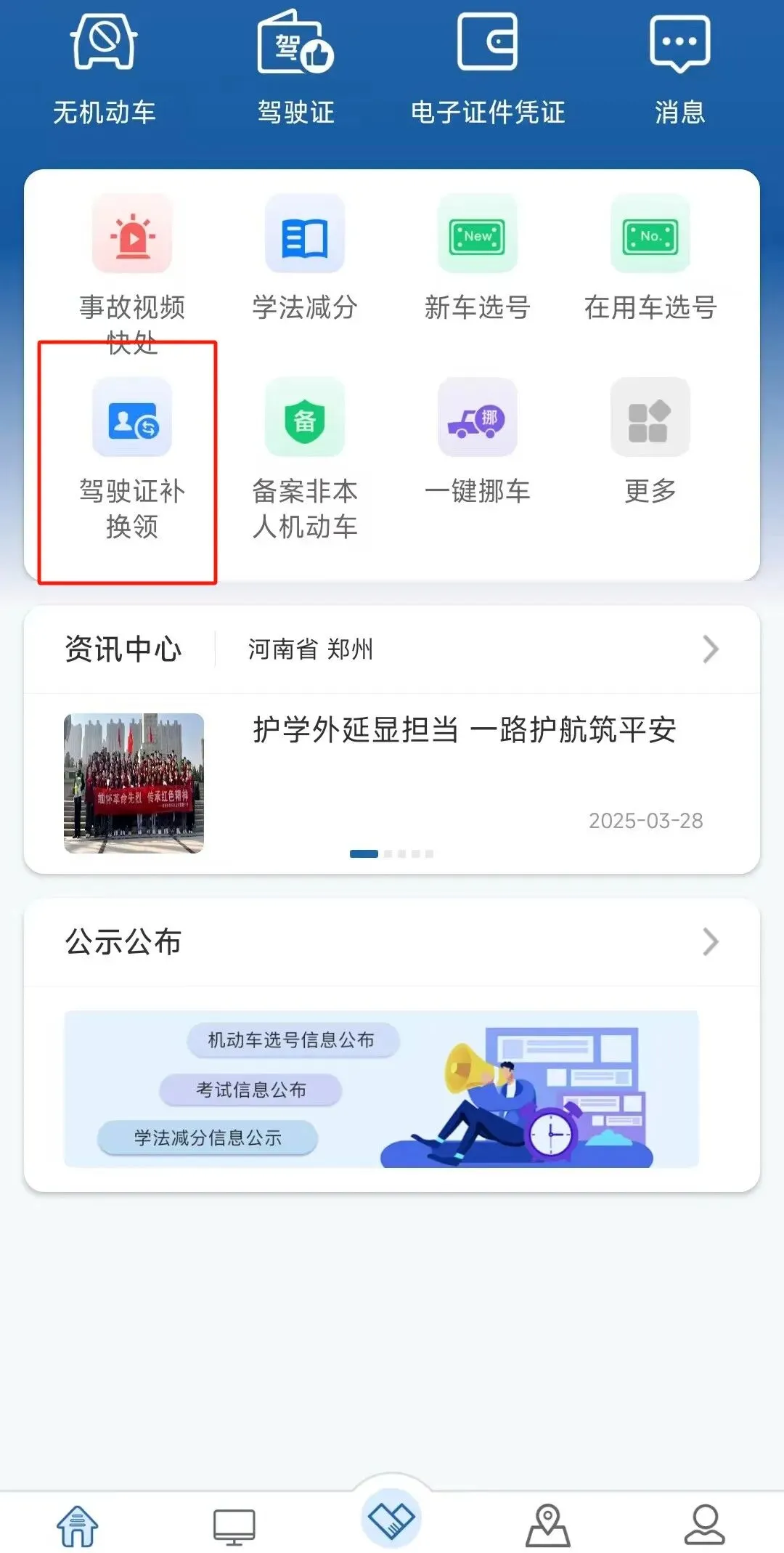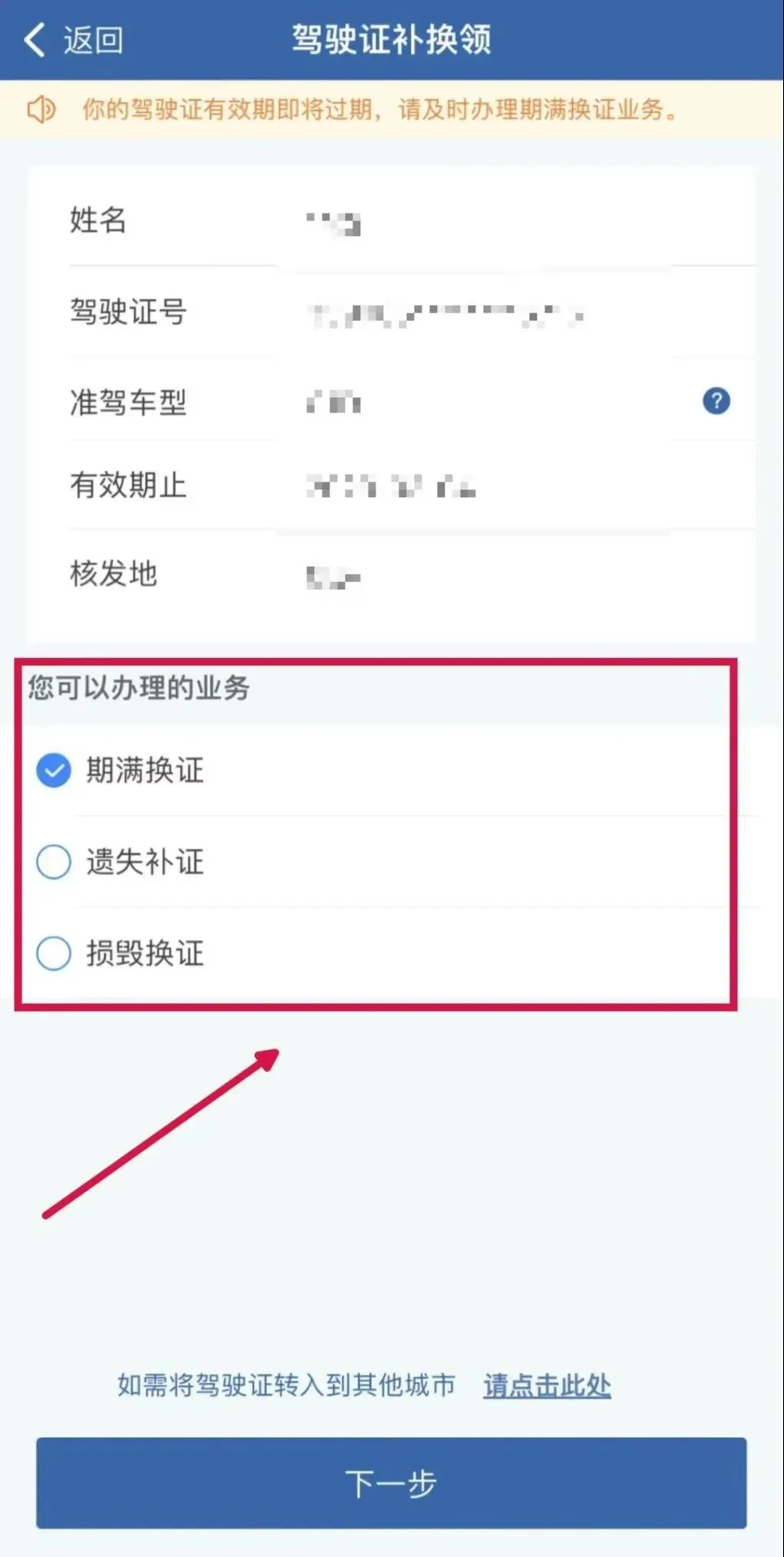 (1)登录"交管12123"APP,点击首页【驾驶证补换领】,进入后选择【在线办理】,选择所需要办理的业务类型