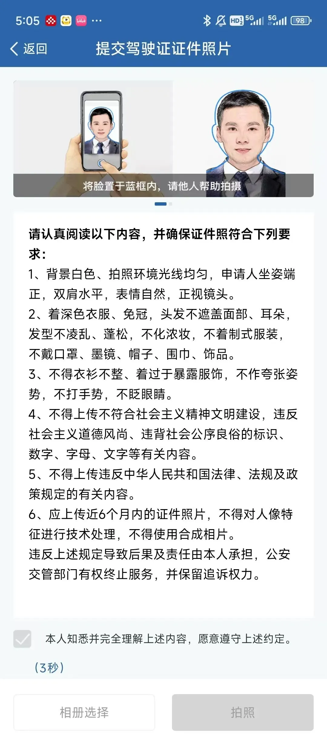 (2)对于存在有效驾驶证照片的,确认是否继续办理或更换照片;对于不存在有效驾驶证照片或更换照片的,可按照系统提示引导,在线提交驾驶证证件照片后继续办理。