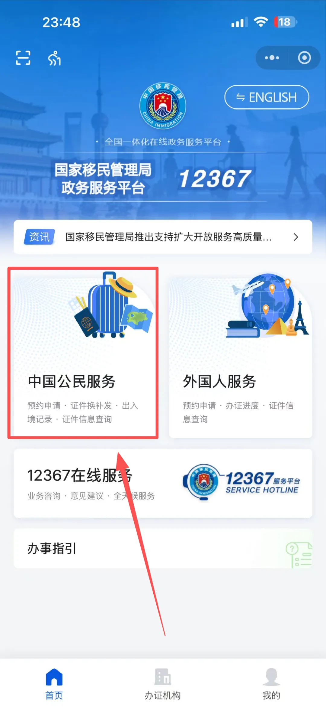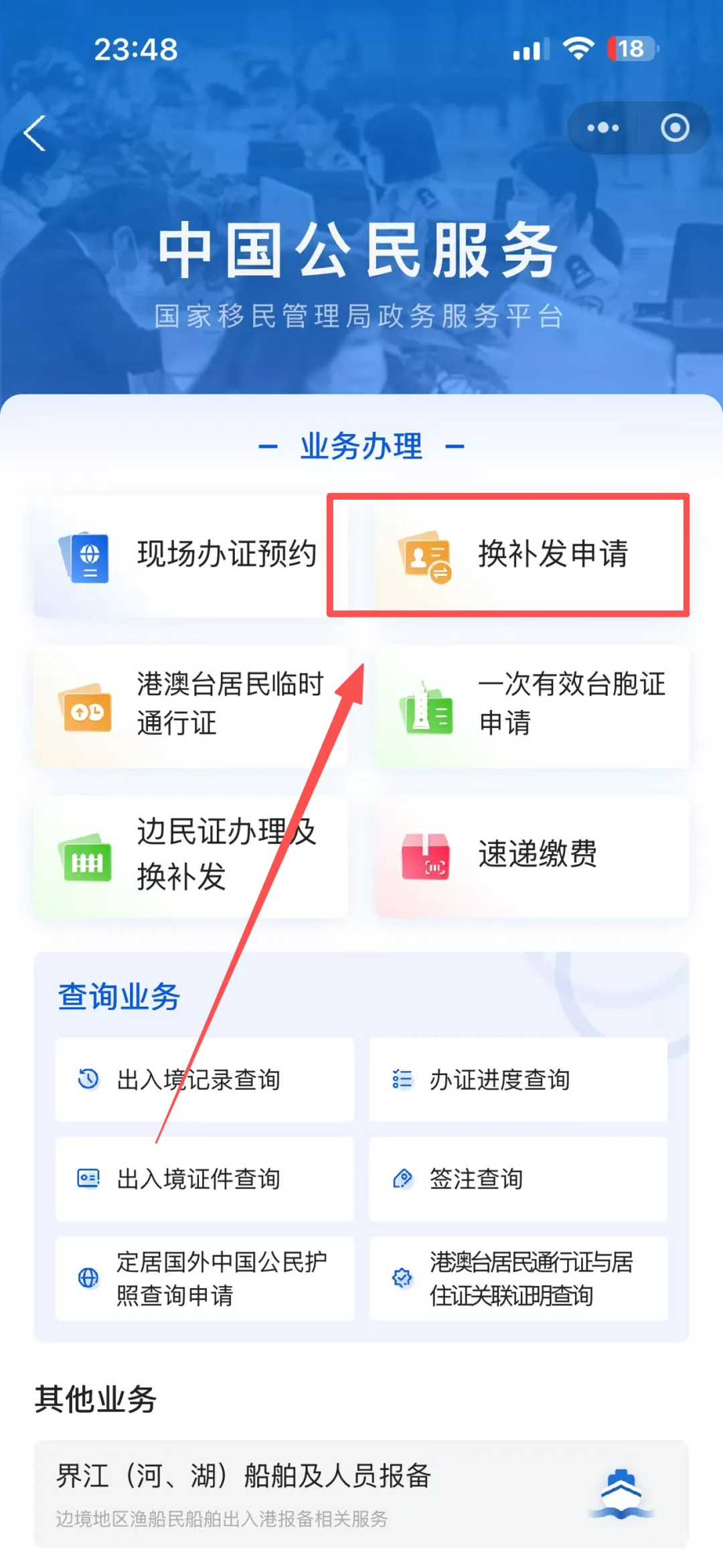 (1)用户可在微信搜索【移民局12367】,进入移民局小程序后,点击【中国公民服务】,点击【换补发申请】,填写个人身份信息登录平台。