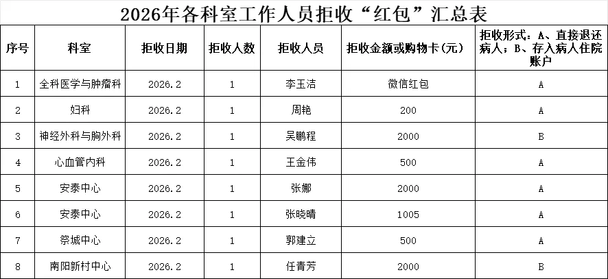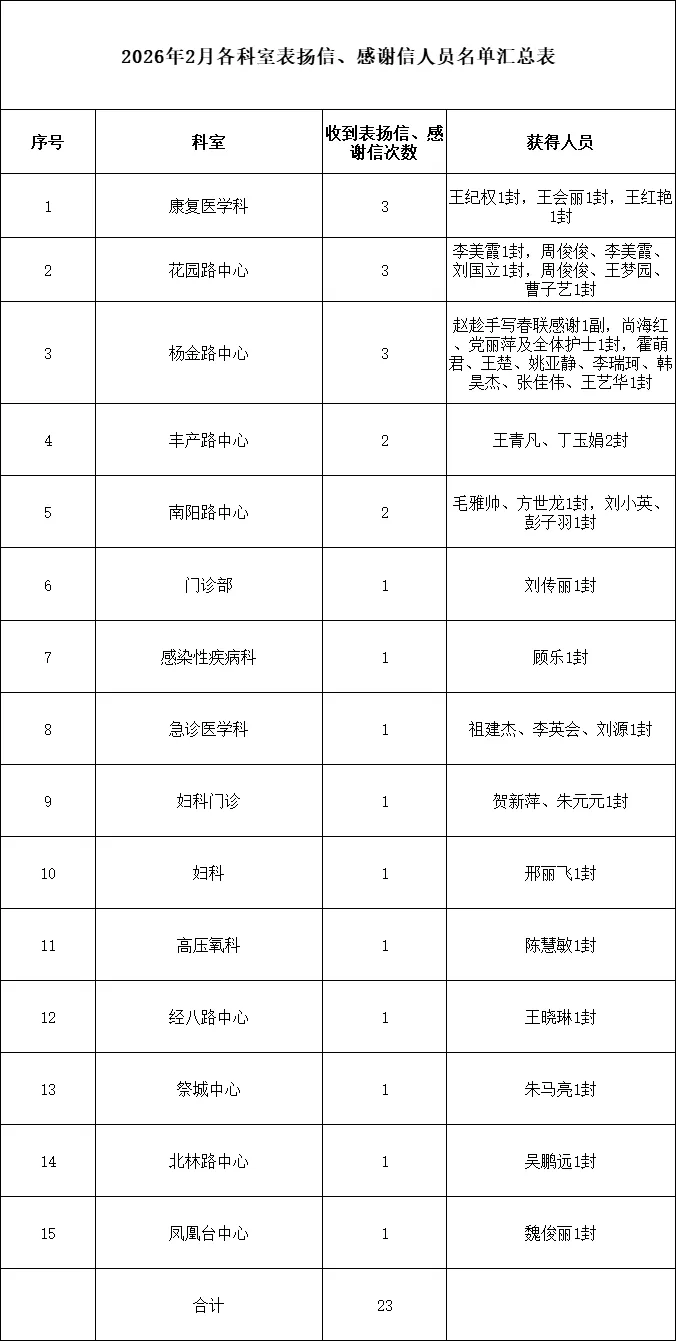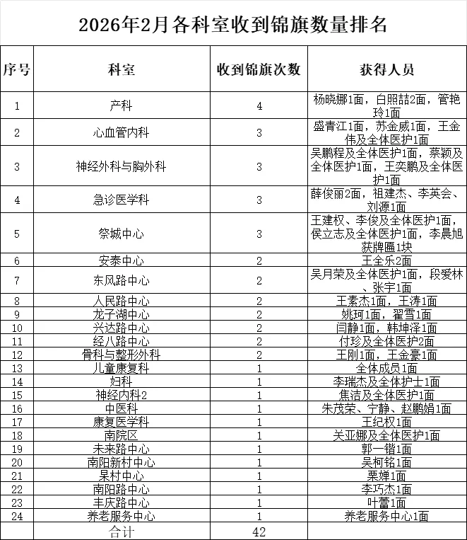 2026年2月我院收到锦旗42面,表扬、感谢信共23封,拒收红包8次。