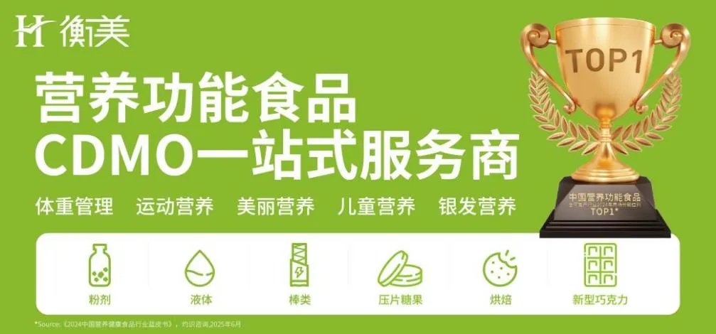 衡美成立于2012年,是一家专业从事营养功能食品研发、生产和销售的高新技术企业,致力于为品牌商客户提供综合性研发生产服务。公司积累了5,000+款个性化产品配方,覆盖体重管理、运动营养、美丽营养、银发营养、儿童营养等主流健康食品市场。产品形态丰富,包括粉剂、液体、棒类、糖果、烘焙等,以满足客户多样化的需求。根据灼识《2024 中国营养健康食品行业蓝皮书》,2024年衡美健康在中国营养功能食品的合同生产领域的市场份额位列第一。