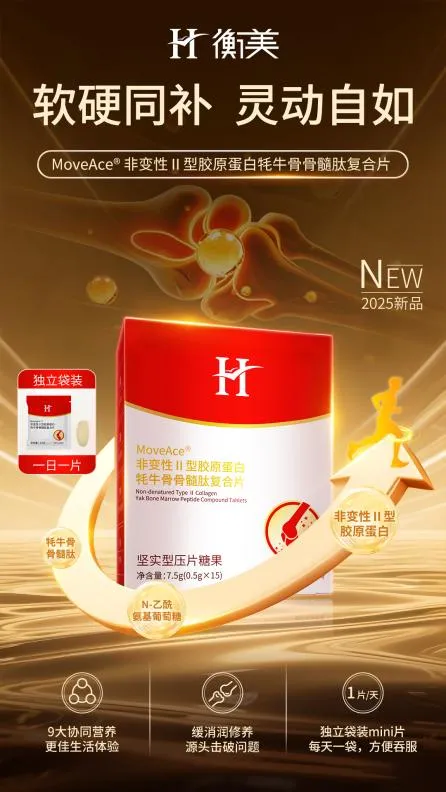 MoveAce®非变性Ⅱ型胶原蛋白牦牛骨骨髓肽复合片采用专利创新组方,多维呵护骨骼健康;特别设计0.5克mini片,搭配独立袋装,优雅便携且吞食轻负担。