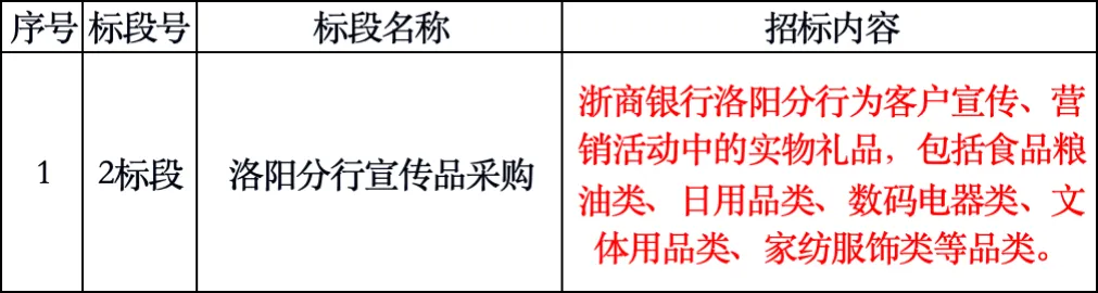 采购范围:浙商银行洛阳分行宣传品采购,包括客户营销及宣传活动所需的实物礼品,如食品粮油类、日用品类、数码电器类、文体用品类、家纺服饰类等