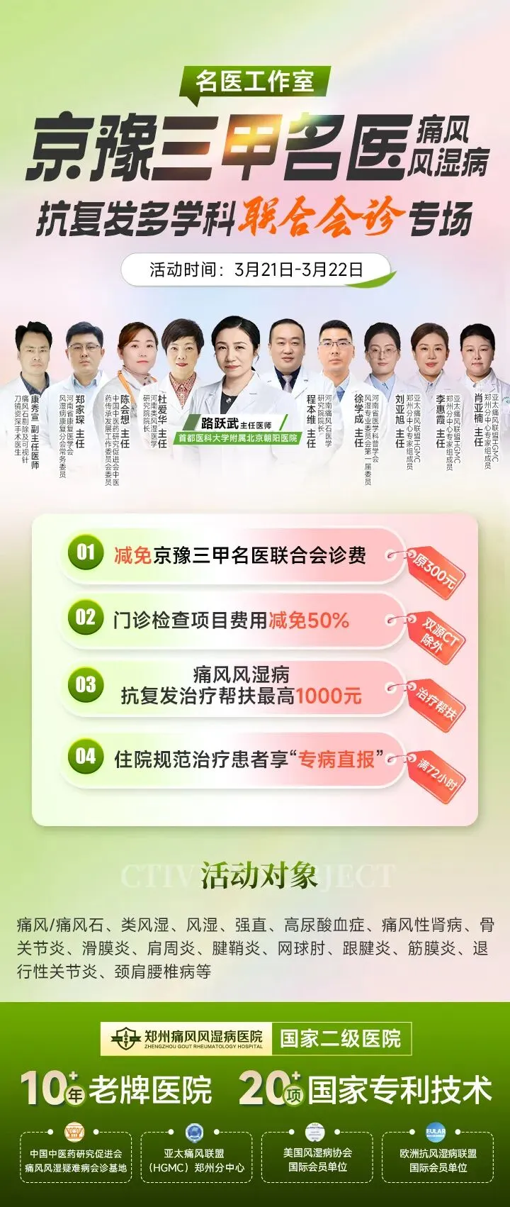 在季节交替、天气变化时,许多痛风、风湿病患者常出现病情反复或加重。痛风、风湿病的诊疗关键在于早诊、早治及抗复发管理,这也是为了避免错过最佳治疗时机,防止关节疼痛加重、活动受限及病情复发。即便达到临床治愈,患者仍需定期接受复查及抗复发干预性治疗,以巩固疗效、实现长期稳定。为此,河南省康复医学会风湿病分会康复临床基地——郑州痛风风湿病医院,将于2026年3月21日至22日开展 “名医工作室|京豫三甲名医痛风、风湿病抗复发多学科联合会诊专场”活动,特邀北京三甲名医开展联合会诊,帮助广大痛风、风湿病患者摆脱疾病反复发作的困扰,回归正常、美好生活。