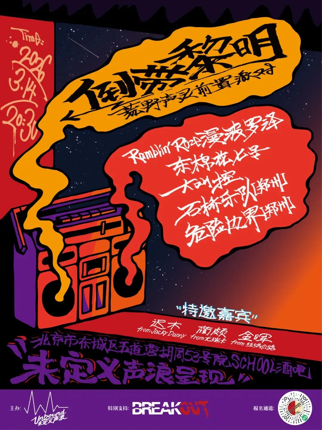 阵容 Lineup:漫波罗泽,东棉花七号,大叫控,石桥乐队(郑州),危险边界(郑州)特邀嘉宾:蔺颇(from 尤瑞卡),迟木(from Jacky Danny),金晖(from 丝绒公路)