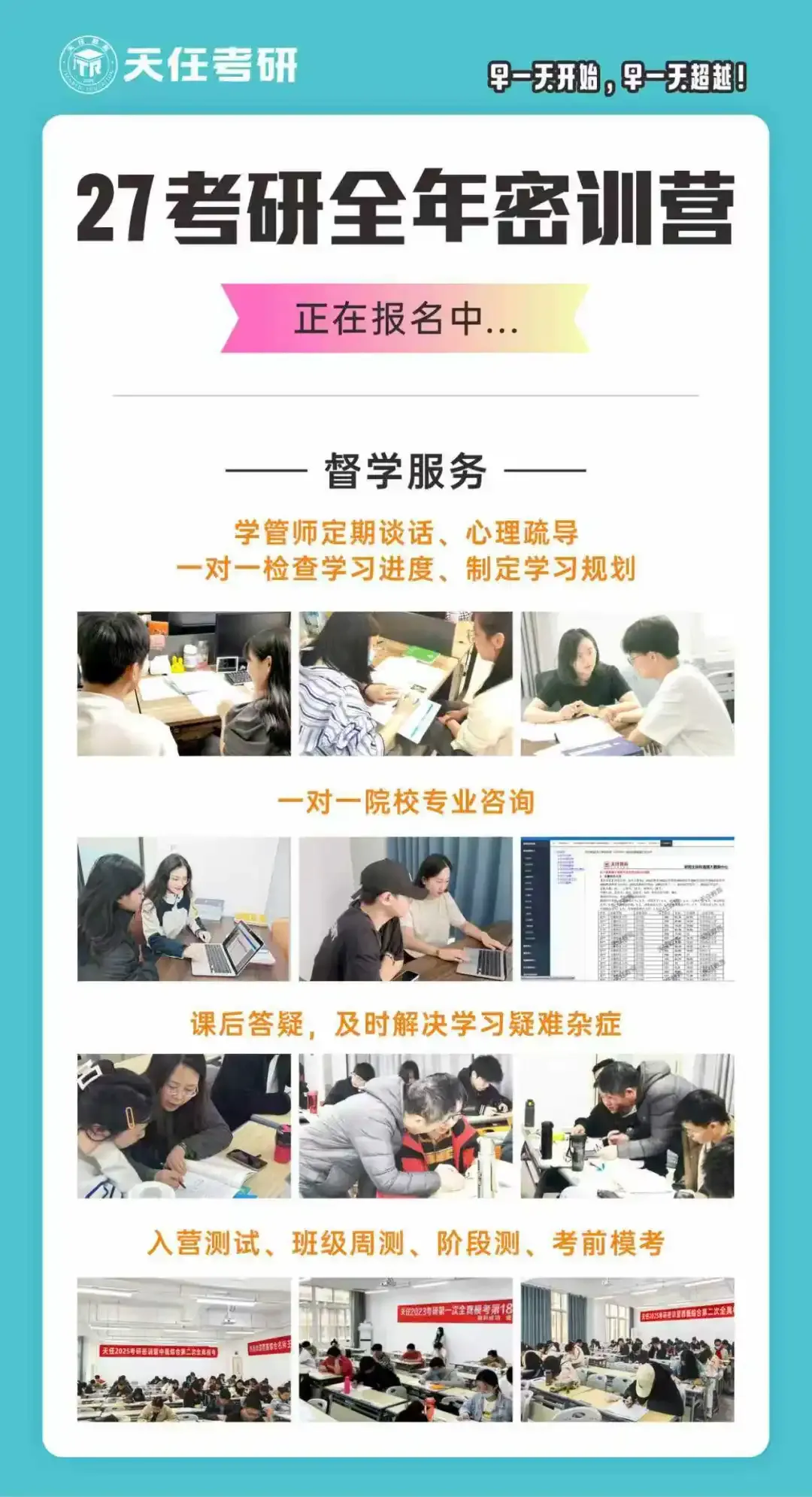 河南天任考研2027届全年密训营正式启动招生!从现在开始,直到你明年3月复试结束,我们将为你提供长达一年多的“高三式”沉浸式备考陪伴!