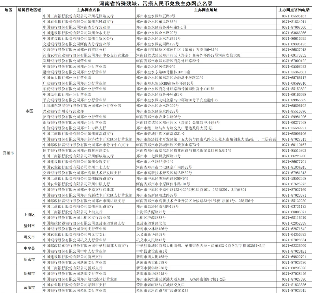 下面是郑州市的主办网点信息,请您参考。