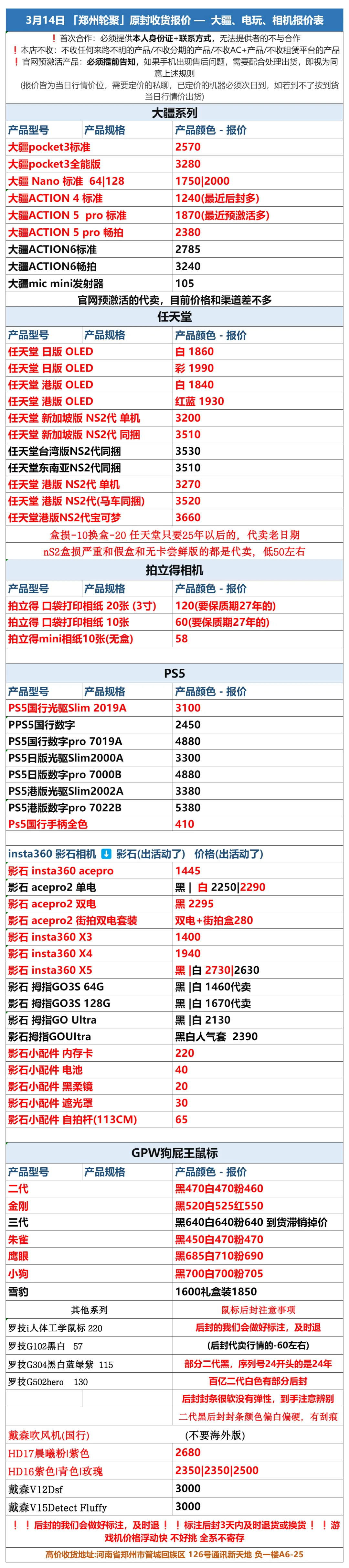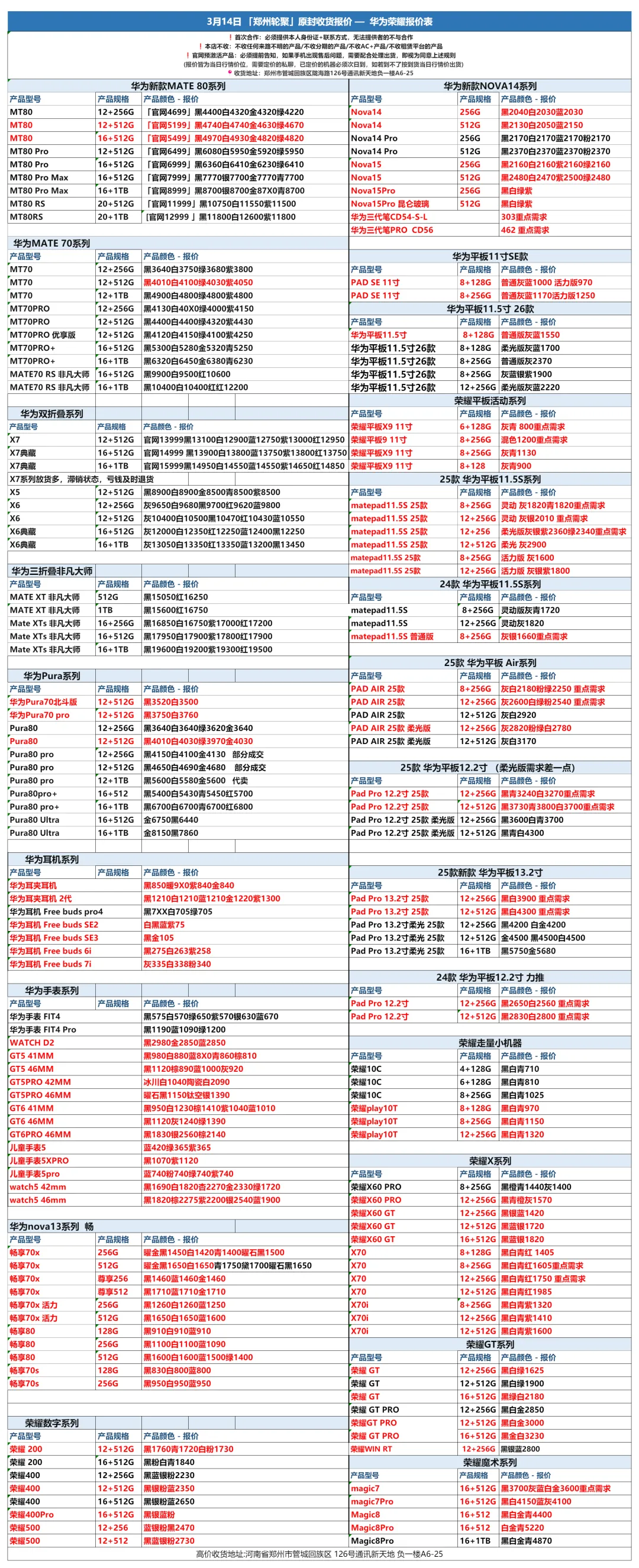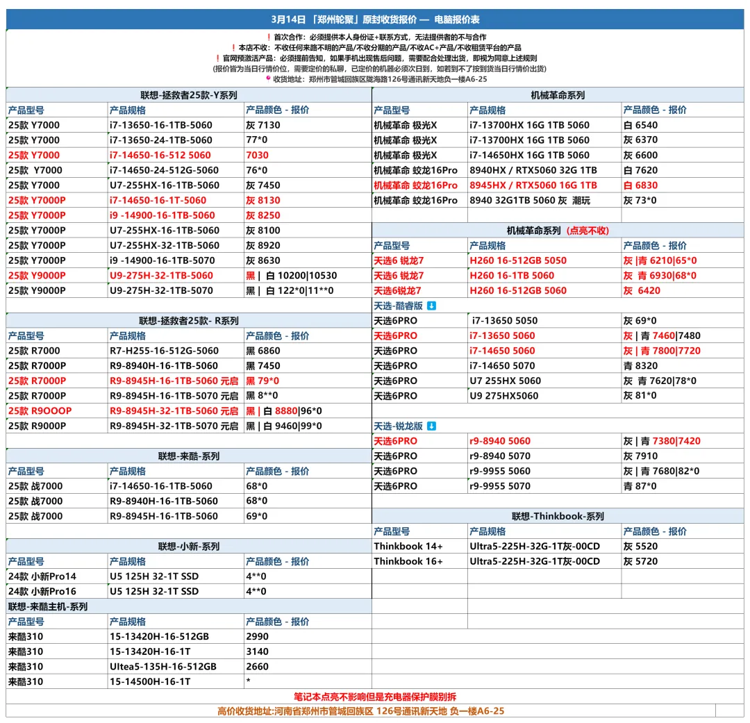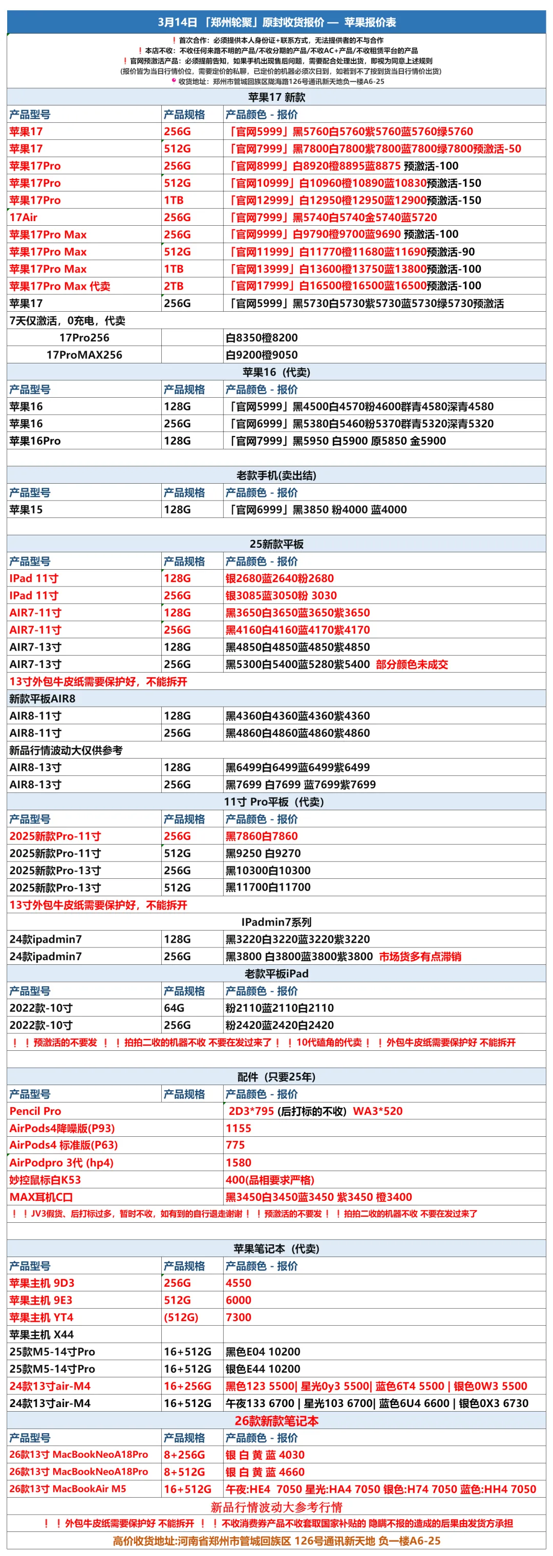 郑州轮聚通讯 2026年3.14日数码报价更新