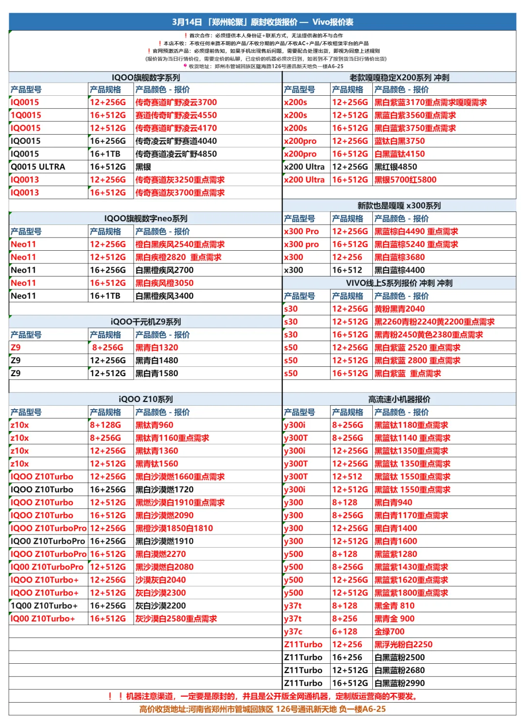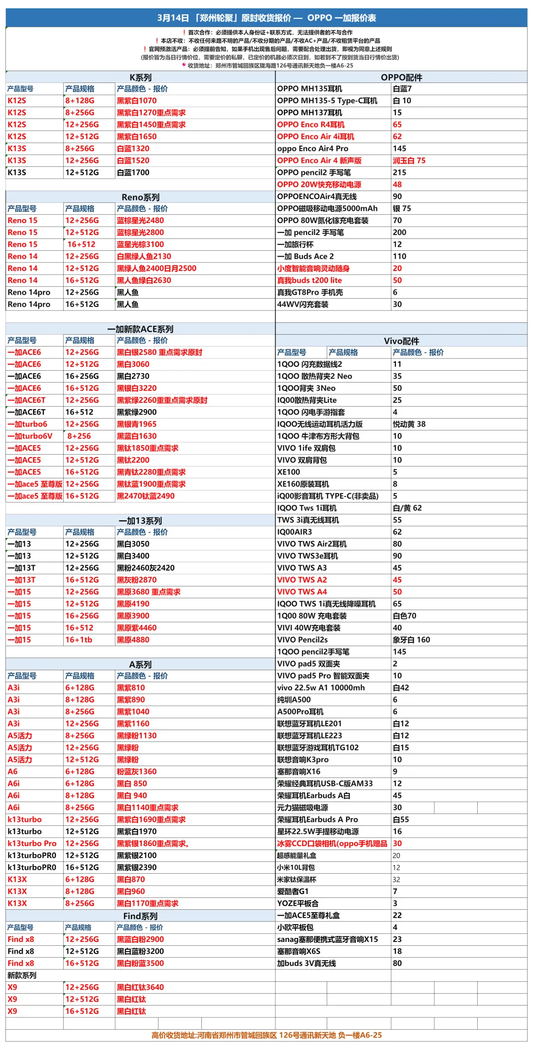>郑州轮聚通讯 2026年3.14日数码报价更新