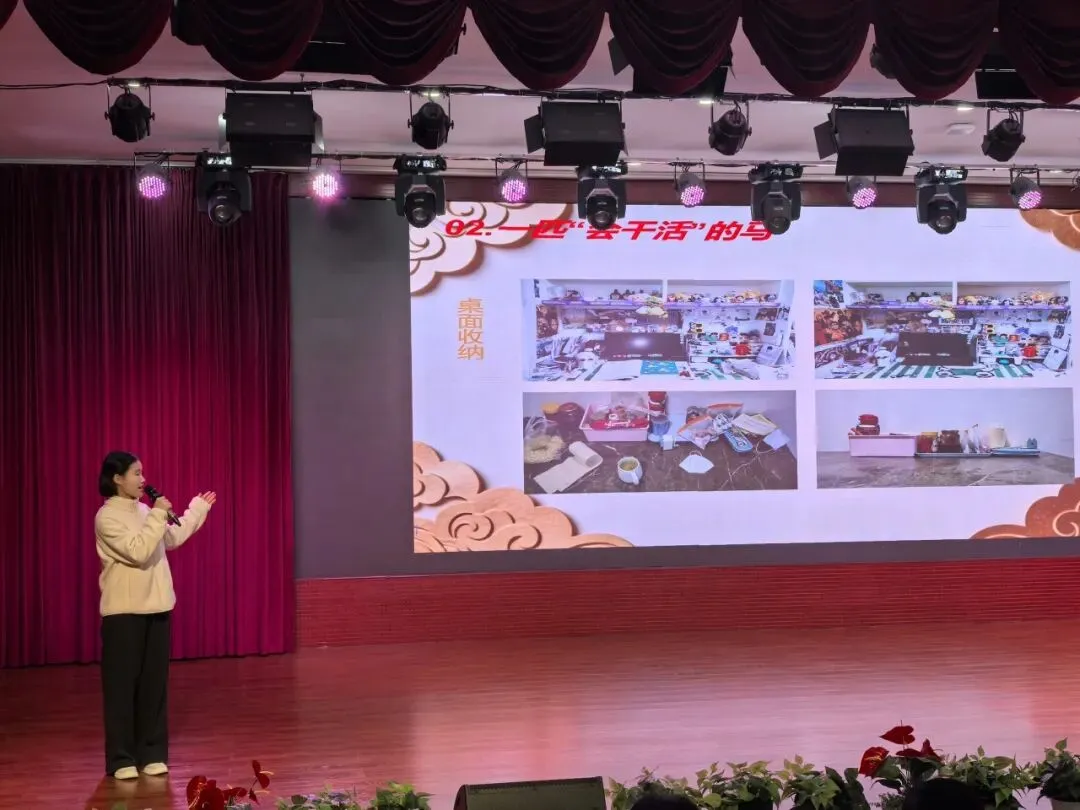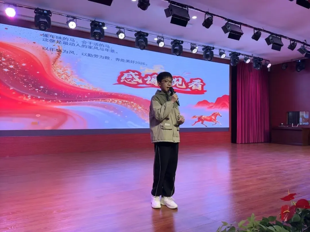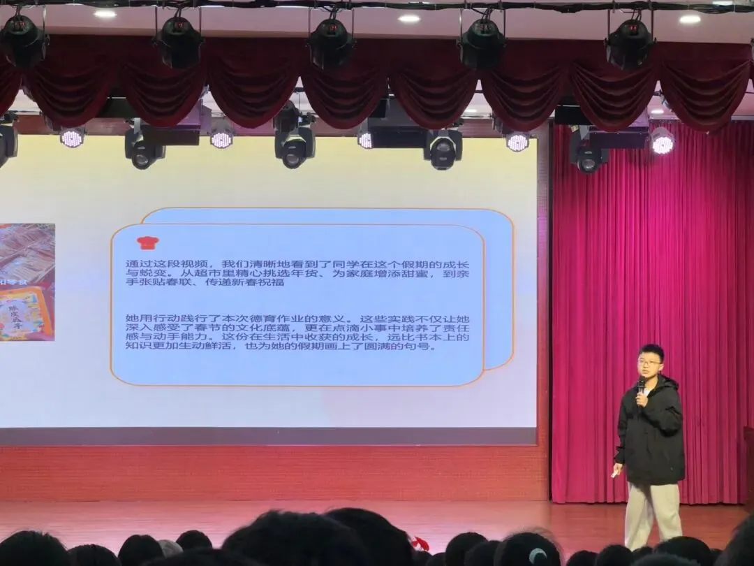 本次德育作业展评聚焦生活化实践,集中展示了2025级学子的寒假德育实践成果,作品形式鲜活、内容丰富。活动现场,各班参赛选手们主动分享贴春联的仪式感、做年夜饭的小插曲等实践经历,在真诚交流中传递快乐、收获成长,现场洋溢着青春向上的氛围。同学们亲手书写的春联,笔墨间彰显传统文化魅力与家国情怀;精心制作的年夜饭,让劳动之乐与家庭温情相融,民俗体验、孝亲敬老等实践活动的照片与视频也轮番呈现,每一份作业都是同学们品德成长的生动印记。整个活动过程中,观众们用心欣赏,优秀作品赢得了阵阵掌声,气氛热烈。