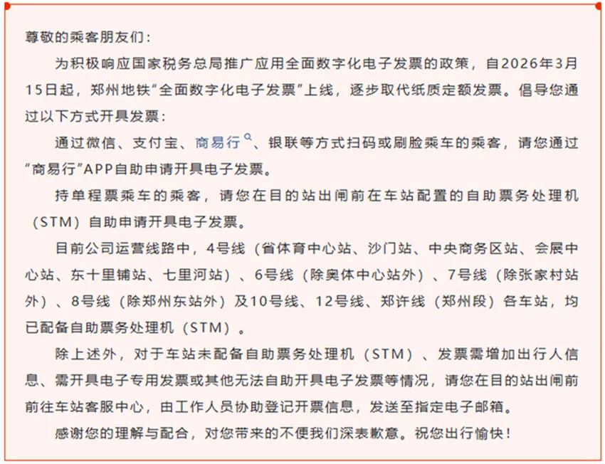 郑州地铁“全面数字化电子发票”今天正式上线,将逐步取代纸质定额发票。乘客可通过“商易行”APP、在车站配置的自助票务处理机(STM)自助申请开具电子发票。