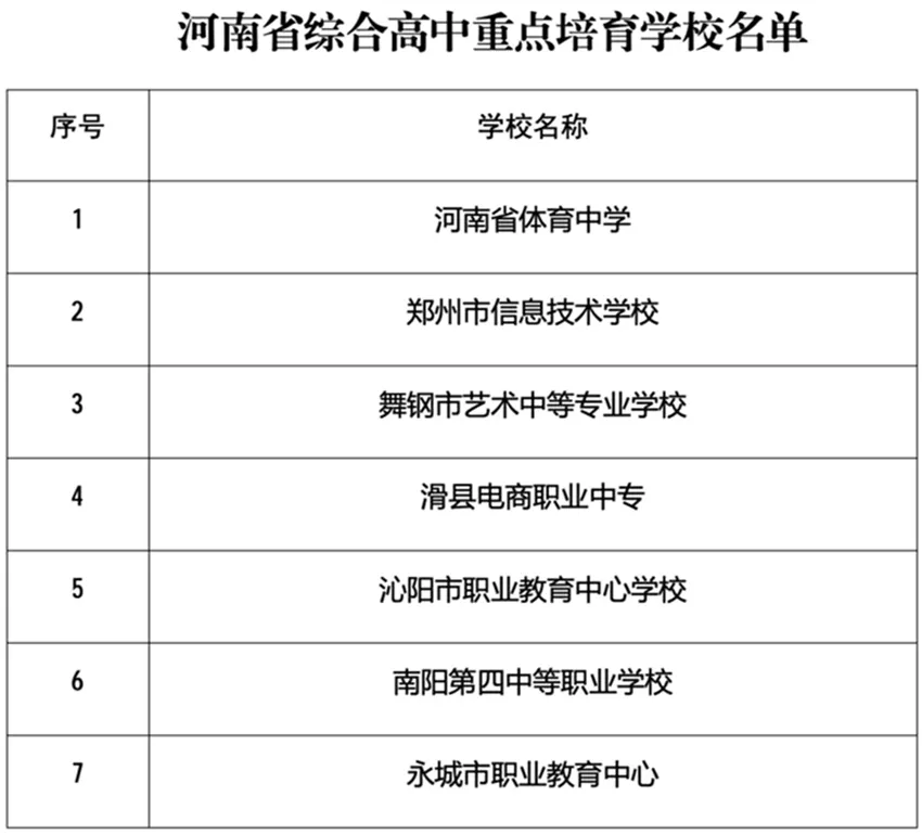 河南省教育厅近日发布关于河南省综合高中重点培育学校名单的公示,经各地推荐、省级审核,河南省体育中学、郑州市信息技术学校等7所学校入选。