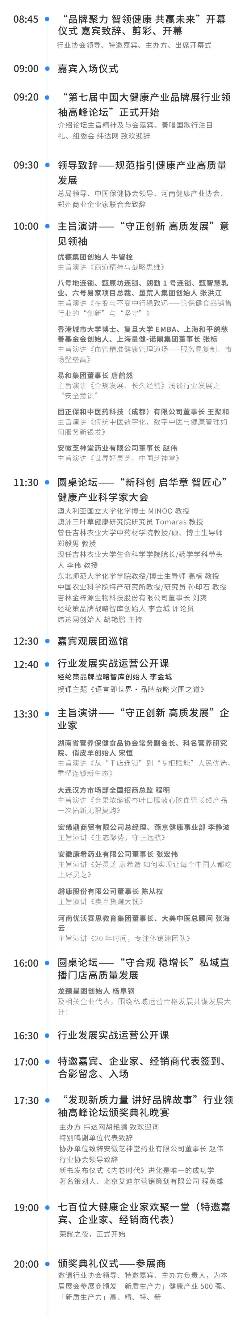 世纪福鑫、东方硒谷、宇航人沙棘、药君堂、固正保和、驮中驼、标王药业集团、怀元帅、亲迈大药房、红峰怀药、寿星翁、益友世家、北京乐目视光、豫山堂、私域跨境电商养生专线、国氢科技、蜜蜂堂、众德怀药、国尚优品、甄极安、人体密码基因、康和中药、天吉人康、易达食用植物油;完达山、聚实集团、奥诺康、仁和制药、中佰康、康达中医透药、藏华堂、康体健康、宝源广通、美耶游、传频仪、北同食代、江西四正、国康伟业、东韵阿胶、康业制药、忆优食客、德宁商贸、绿健园、河北康享、鑫达源包装、御养时代、佐盈森、宜品羊奶粉、郑州沛元食品、怀明堂、汉方药业、五台山沙棘、普惠天成、士卫堂、新融合、德瑞万家、沐康坊、利宸乳业、富元康灵芝、华鲵生物、髓多多、科举药业、互成国际、康奇股份、华坤农业、东润三胶堂、百心科技、西霖二酯油、百鹿堂、乐邦医疗、肽都集团、芝百世灵芝、衡美健康、天台乌药、天赐天年、天士力大健康、纤仔科技、汉方济世、和氏乳业、真好惠、辰朗健康产业、希百康、北京中蜜、福爸寿妈、日光龙脑、创源堂、晋之乡醋业、学宜诚、英童乳业、广州龙茂、合肥荣事达、岐伯谷、铭基农业、康金瑞等200余家健康产业500强企业,纷纷设立展位,迎接全国健康产业一线代理商的莅临。