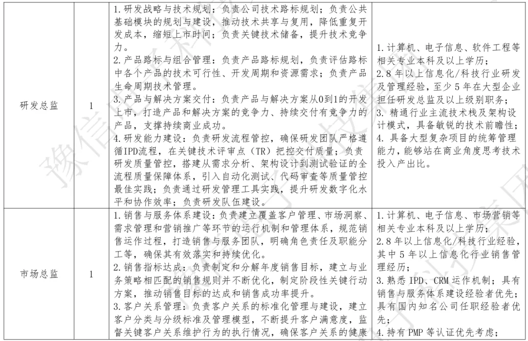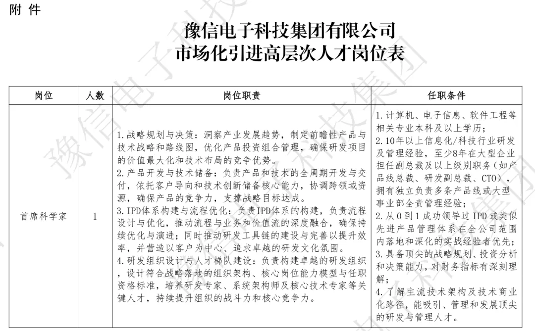 2.具体岗位职责和任职条件,详见附件《豫信电子科技集团有限公司市场化引进高层次人才岗位表》,特别优秀者可适当放宽条件。