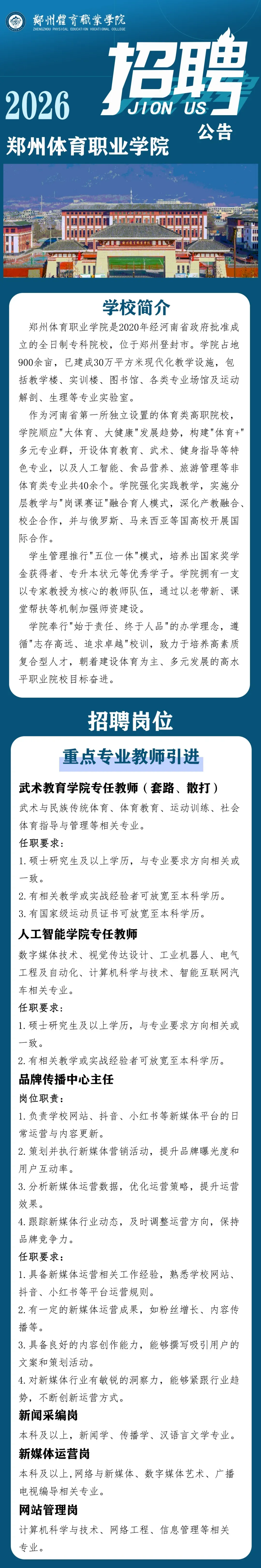 >河南招聘,郑州体育职业学院2026年招聘