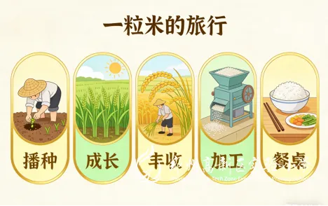 米饭是我们餐桌上最常见的主食。每一碗热气腾腾的白米饭,都藏着一段跨越四季的奇妙旅程。本周食育小知识,让我们一起走进一粒米的旅行,感受粮食从种子到餐桌的不易。