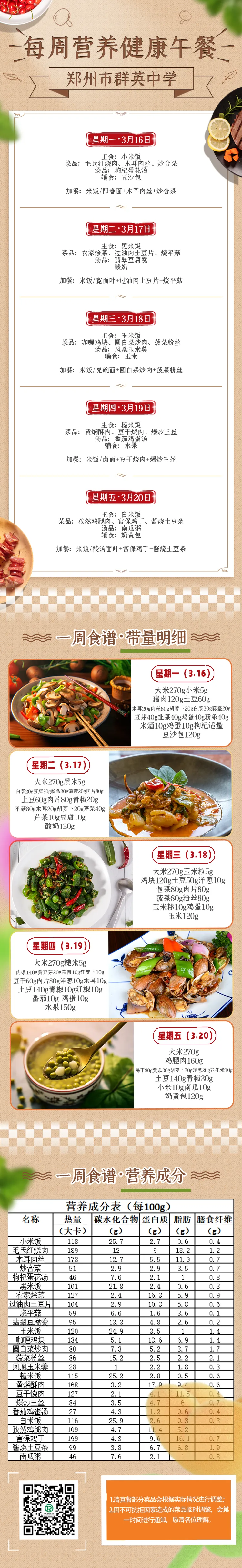郑州群英中学每周营养健康食谱(3月16日-3月20日)