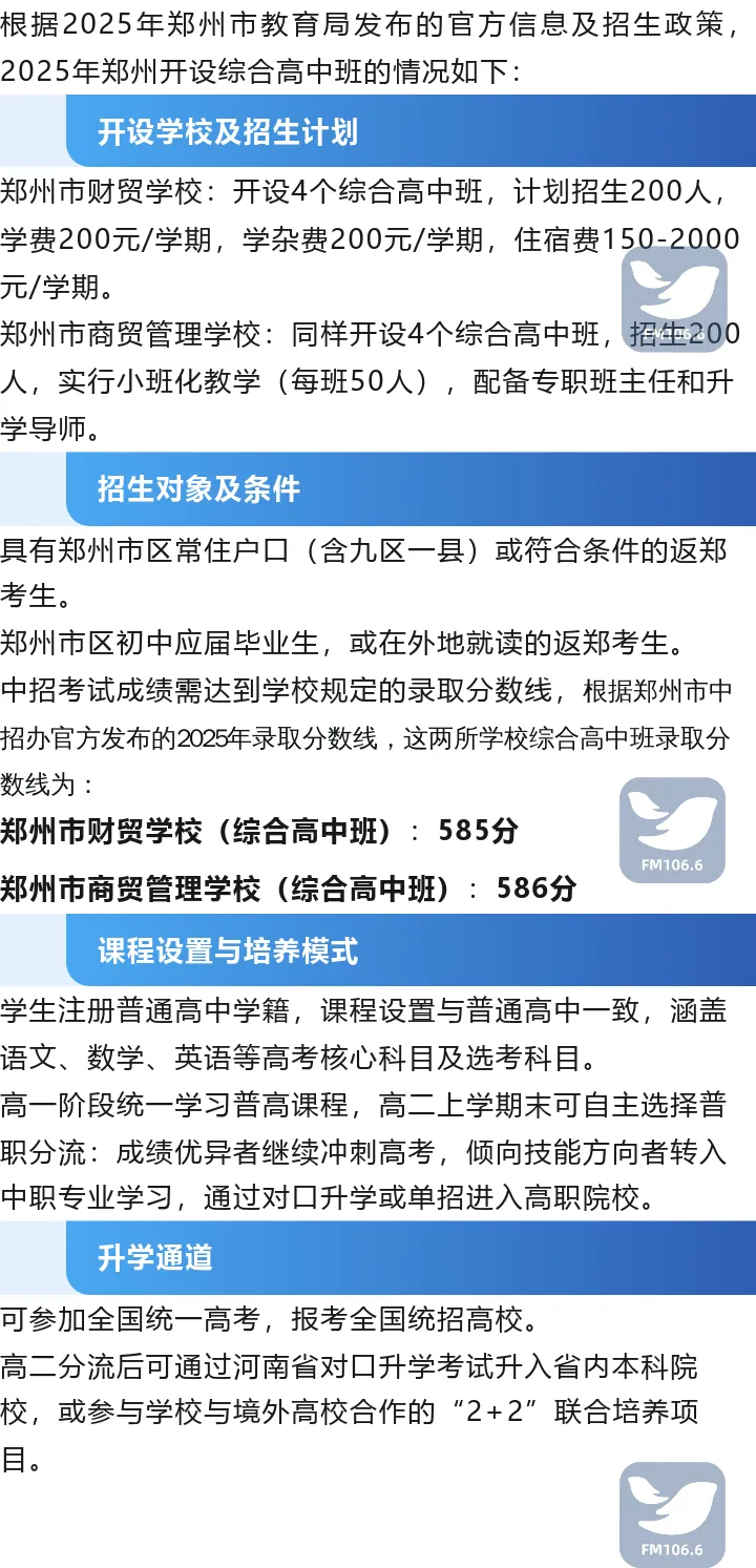 ,是河南省探索中等职业教育与普通高中教育多元立交的培养机制,促进职普融通和高中阶段教育优质多样发展的新尝试。综合高中班学生入学单独编班,全部注册为普通高中学籍。