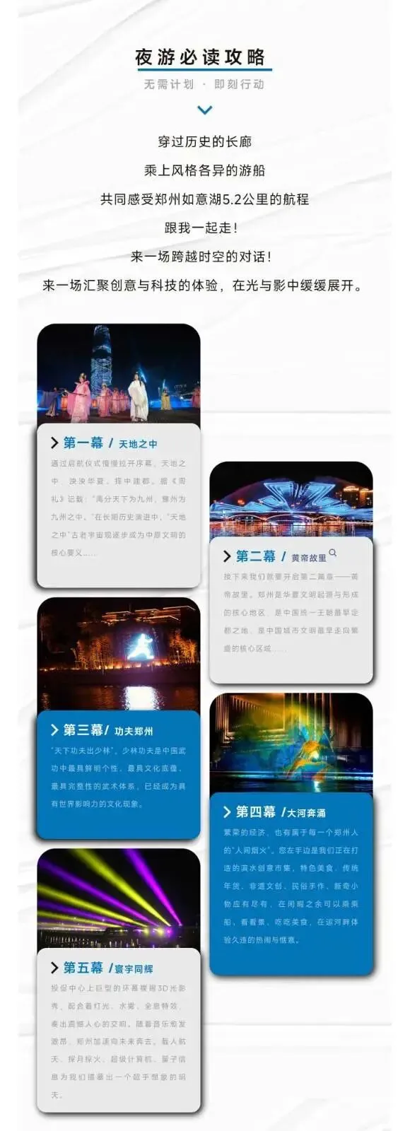 “如意龙湖·船说郑州”城市水上演艺,湖光作幕,船影为笔,夜晚,灯火在碧波中散成一片星光。日游赏湖,夜游观演,花船划过水面时,也划开了这个春天的序幕