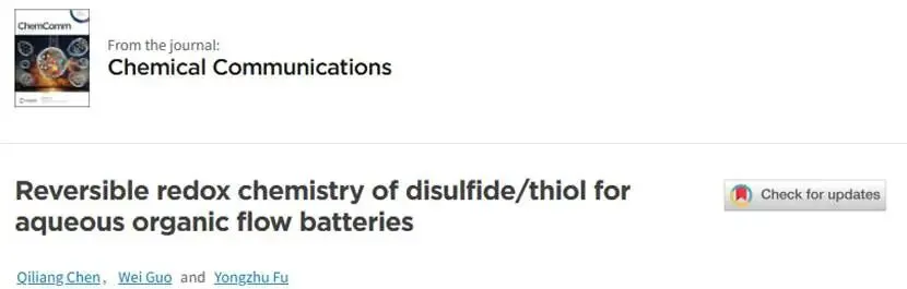 Qiliang Chen ,Wei Guo ,Yongzhu Fu,Reversible redox chemistry of disulfide/thiol for aqueous organic flow batteries,2026,Chemical Communications