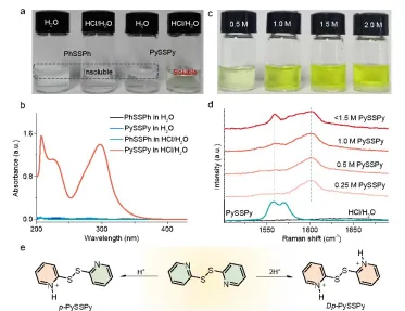 图2(a)PySSPy或PhSSPh在H₂O或HCl/H₂O中的溶解现象;(b) (a)中上清液经2000倍稀释后的紫外-可见光谱;(c)PySSPy在HCl/H₂O中的溶解度测试;(d)不同浓度下PySSPy在HCl/H₂O中的拉曼光谱;(e)双/单质子化PySSPy的形成过程