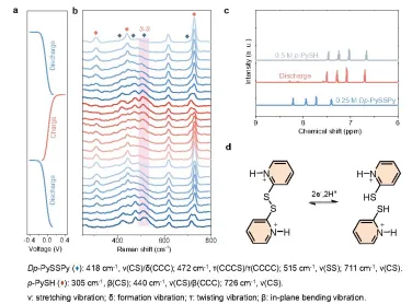 图3采用0.25MDp-PySSPy作为阴极电解液、0.5Mp-Py5H作为阳极电解液的(a)对称电池电压曲线及(b)对应的原位拉曼光谱;0.25MDp-PySSPy、放电产物及0.5Mp-PySH的(c)¹H核磁共振谱和(d)Dp-PySSPy的氧化还原机理