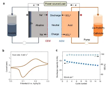 基于Py可被质子化的原理,本文提出了一种具有高水溶性和2电子转移能力的Dp-PySSPy/p-PySH氧化还原化学体系用于AORFBs。Dp-PySSPy/p-PySH的氧化还原可逆性发生在相对于Ag/AgCl的0.2V氧化还原电位处。在还原过程中,Dp-PySSPy中的S-S键在获得两个电子后断裂,随后与H+结合形成pPySH,该过程在氧化时可逆。通过与碱性Zn/Zn(OH)₄²-作为阳极氧化还原基团配对,Dp-PySSPy/p-PySH的阴极氧化还原基团可实现工作电压为1.65V的双膜RFB。尽管强酸性电解质提高了材料的溶解度,但会影响运行期间的材料稳定性。此外,对于当前pH解耦RFBs,在运行期间维持稳定的pH具有挑战性。因此,Zn-Dp-PySSPy基RFB的性能应通过膜或分子结构优化进一步提升。