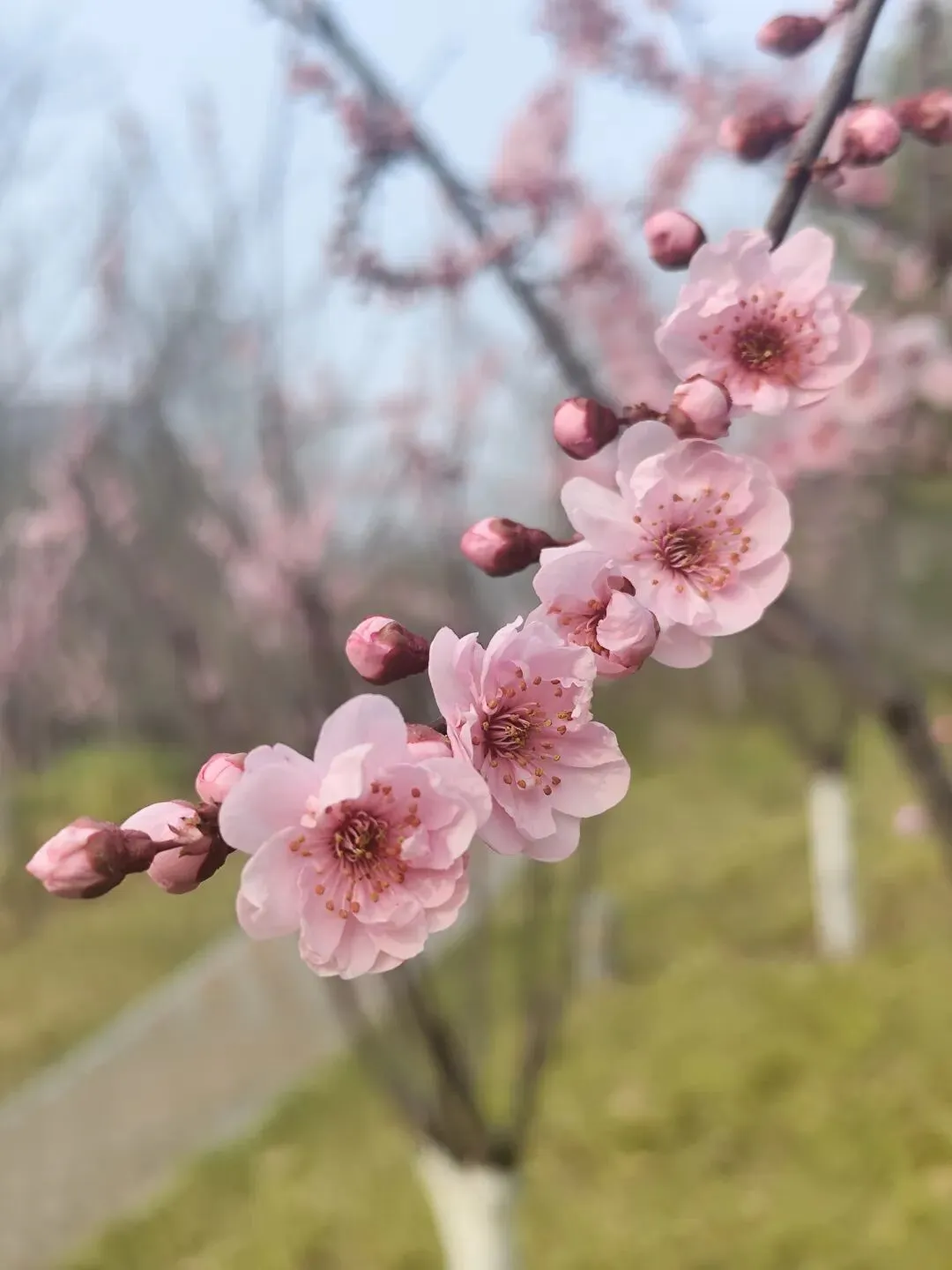 右岸是西流湖公园的精华部分,前段时间江梅、宫粉、朱砂、绿萼、杏梅麇集开放,争奇斗艳,引得游人如织。而今残红褪尽,梅树成空。宫粉和紫叶李杂交而成的假梅——美人梅却独自呈研,美人梅的重瓣繁花温柔又明媚,像一位眉眼含春、笑靥动人的古典美人,勾引得人类摆拍不止。