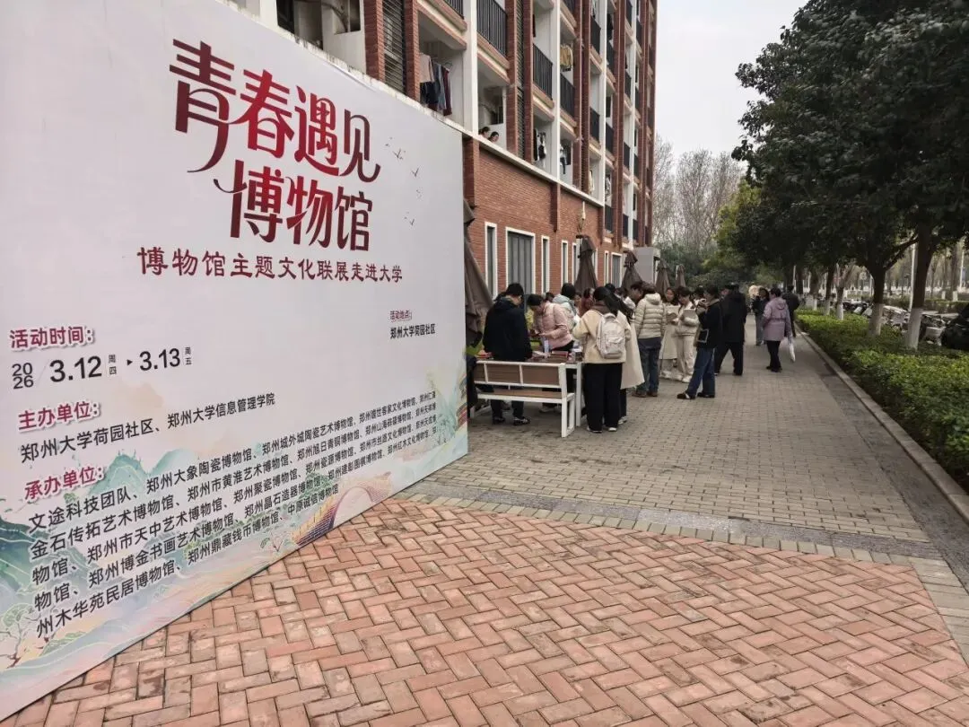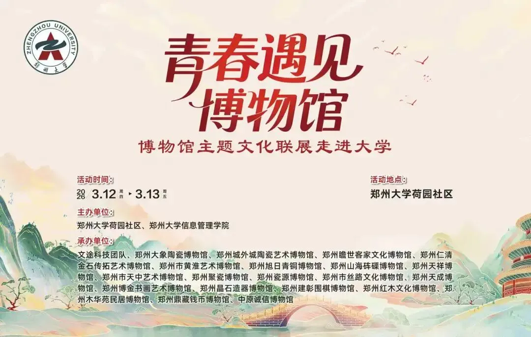 2026年3月12日至13日,“青春遇见博物馆——博物馆主题文化联展走进郑州大学活动”在郑州大学荷园社区圆满举办。活动由郑州大学荷园社区、郑州大学信息管理学院主办,文途科技团队及郑州大象陶瓷博物馆、郑州城外城陶瓷艺术博物馆、郑州瞻世客家文化博物馆、郑州仁清金石传拓艺术博物馆、郑州市黄淮艺术博物馆、郑州旭日青铜博物馆、郑州山海砗磲博物馆、郑州天祥博物馆、郑州市天中艺术博物馆、郑州聚瓷博物馆、郑州瓷源博物馆、郑州市丝路文化博物馆、郑州天成博物馆、郑州博金书画艺术博物馆、郑州晶石造器博物馆、郑州建彰围棋博物馆、郑州红木文化博物馆、郑州木华苑民居博物馆、郑州鼎藏钱币博物馆、中原诚信博物馆共20家博物馆承办,从而推进馆校合作,让优秀传统文化走进校园,让大学生感受传统文化的魅力。