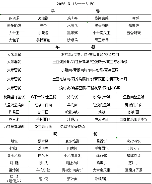 餐厅中午有免费绿豆水或咸汤,学生吃完主食(面条、米饭等)后,可以免费加餐。