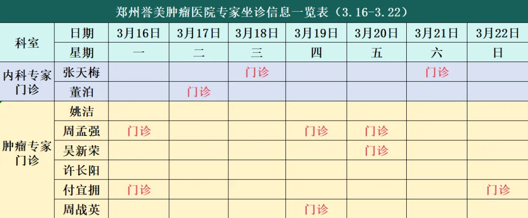 【本周专家预告】郑州誉美肿瘤医院3月16日-3月22日专家坐诊安排来啦!