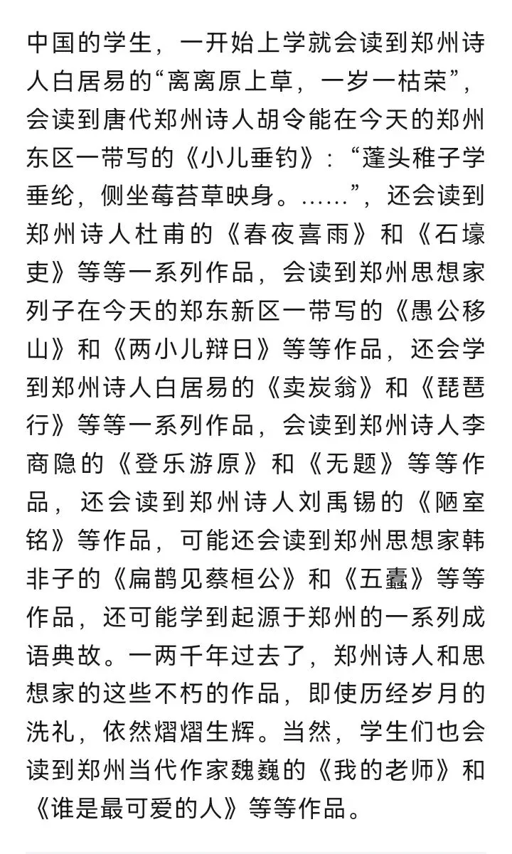 希望郑州市能够把历代文人写郑州的诗词作品,印刷在郑州的一些显眼的位置,比如公交车站牌下面的空白处,比如地铁站,比如火车站和飞机场等等,叫响“象棋之都,唐诗名城”的城市品牌。希望郑州市能保护修复虎牢关、鸿沟、夕阳楼、开元寺塔、侯月台、浮波亭、管城驿、凤凰台等郑州古代名胜。西安能开发秦始皇陵的旅游,为什么郑州不能开发北宋皇陵和后周皇陵的旅游?省外能宣传齐鲁文化、秦文化、楚文化、燕赵文化,为什么郑州不能宣传郑韩文化?山东能宣传孔子孟子,为什么郑州不能宣传韩非子、列子和管子?也欢迎洛阳和开封等地的朋友,多到郑州走走看看。郑州的大河村遗址博物馆、河南博物院、郑州商都遗址博物院、郑州文庙、郑州城隍庙、郑州市博物馆、郑州古荥汉代冶铁遗址博物馆、黄帝故里、郑韩故城、后周皇陵、北宋皇陵、巩县石窟、杜甫故里、白居易故里、刘禹锡公园、李商隐公园、列子故里、汉三阙、打虎亭汉墓等等,都蕴含着丰富的文化底蕴。省会郑州,既是一个新兴的现代大都会,也是一个值得所有河南人自豪的千年古都和历史文化名城。黄河之都,黄帝故里。夏商故都,汉唐名城。春秋首霸,战国七雄。象棋之都,唐诗名城。中华之源,中京郑州。