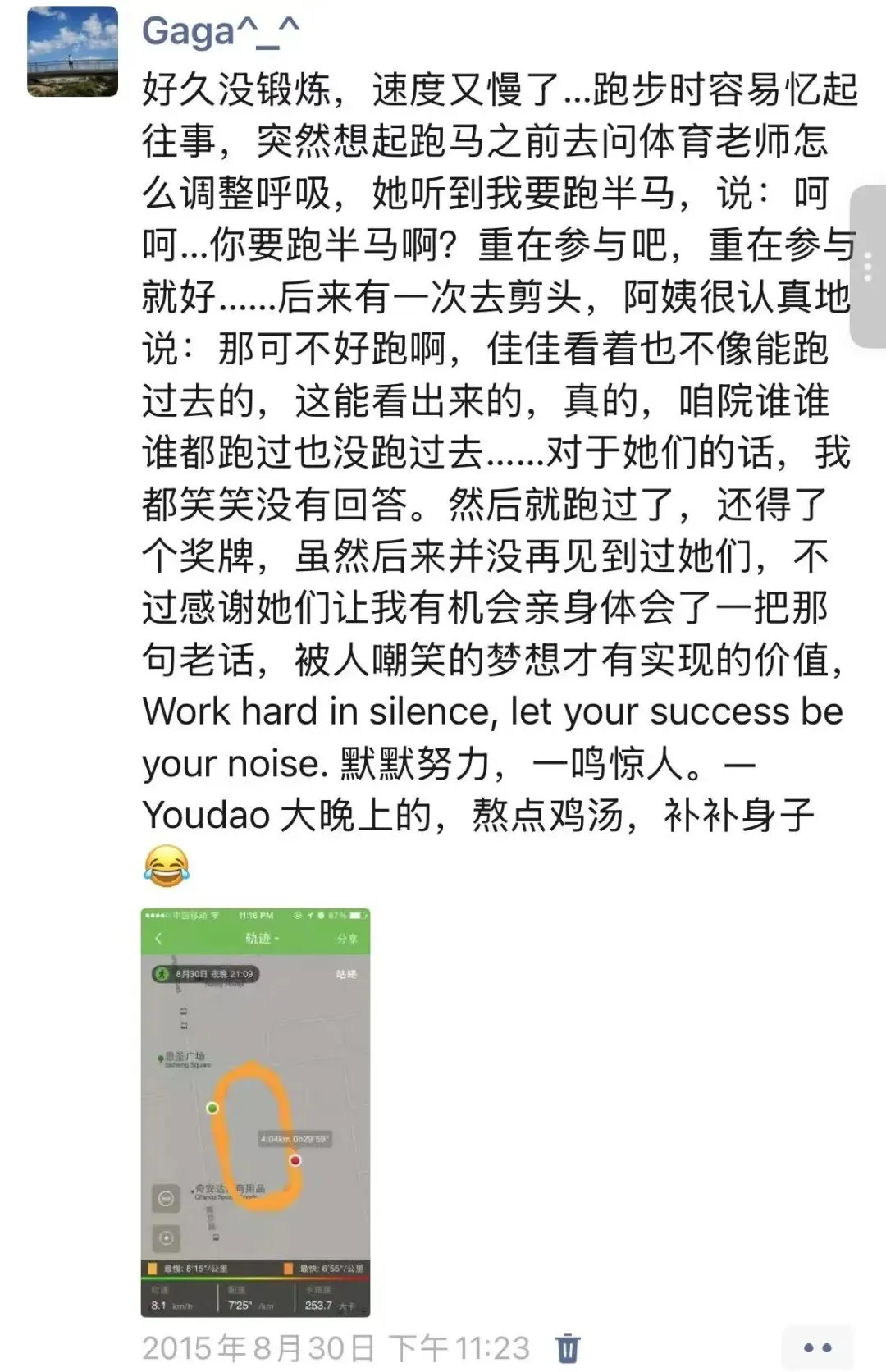 )后来要报马拉松这个事还被嘲笑了,心里暗暗下决心:不管怎么样都要跑下来,不争馒头争口气!
