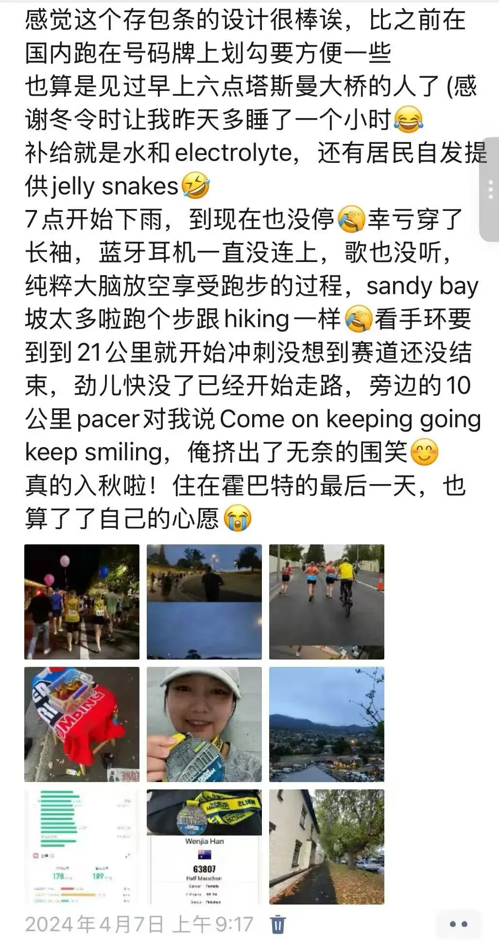 其实心里非常忐忑,因为赛前要签署一个声明,里面有一条是:赛前两周感冒的不建议参赛,否则产生的健康风险自负之类的。就是那么刚刚好,我赛前两周左右感冒了,跑过的最远距离也只是在学校操场完成了10公里,不过感冒也好得快,硬着头皮上了。也顺利完赛了,虽然离关门时间只剩十几分钟。第一次完成半程马拉松破除了我巨大的恐惧,而且开始享受马拉松,我显然不是争夺名次的选手,跑步的过程中更多时间花在留意路上的风景,和加油助威的人群互动,累了就走一会儿,吃吃喝喝路边的花样补给,或者找个速度差不多的跑友聊两句