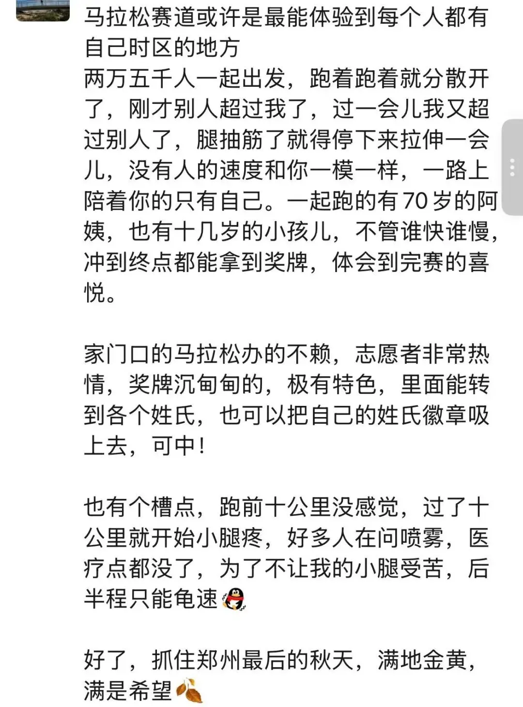 赛道那么长,有人起步就冲,有人中途发力,有人慢慢悠悠也能到终点。不必盯着别人的配速,乱了自己的步伐。人生也像一场马拉松,按照自己的节奏,走完属于自己的路。不争一时快慢,不比一时高低。平安健康,心安自在, 比什么都重要。 从领物开始就感受到精心的赛会组织和志愿者的热情,再到装的满满的参赛包完赛包,外地过来参赛的网友对郑马铺天盖地的好评,自己真的也很自豪!