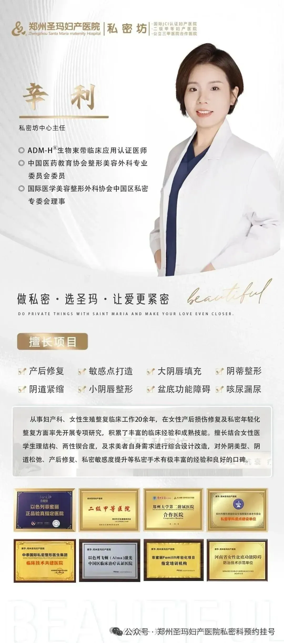 郑州圣玛妇产医院 · 私密坊是融合医、教、研、创新医学模式的专业生殖整复医美中心,是拥有妇科+整形外科双资质的医疗级私密整复医美机构,全面开展私密整形、私密美化、私密抗衰维养、女性功能复健、盆底康复及高难度的生殖整形修复等高品质诊疗服务,始终与世界私密领域共振,领跑于整复行业前沿。
