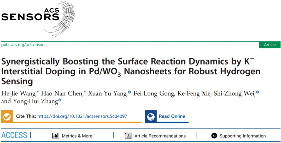K+间隙掺杂调节材料表面活性,并通过化学增敏剂(Pd NPs)修饰增强其H2传感性能。值得注意的是,通过氩气煅烧调节材料的表面特性和金属与载体之间的关系。密度泛函理论(DFT)计算和详细的结构研究证实,K+与H2目标气体之间存在特定的化学反应,丰富的表面O2-(ad)物种及多组分协同作用增强了其在低温下的H2感知能力。本文不仅为高性能氢气传感器提供了新材料体系,而且还通过各种尺度表征与机理建模,深化了对氢溢流效应与异质结协同机制的理解,同时还为金属氧化物气敏材料的理性设计奠定了理论基础。本研究结果有望推动氢能安全监测技术的实际应用,并为其它还原性气体传感器的开发提供新思路。相关成果以“Synergistically Boosting the Surface Reaction Dynamics by K+ Interstitially Doping in Pd/WO3 Nanosheets for Robust Hydrogen Sensing”为题在国际知名期刊ACS Sensors上发表。第一作者为2024级硕士研究生王贺杰,张永辉教授,魏世忠教授,杨玄宇研究员为为论文共同通讯作者。