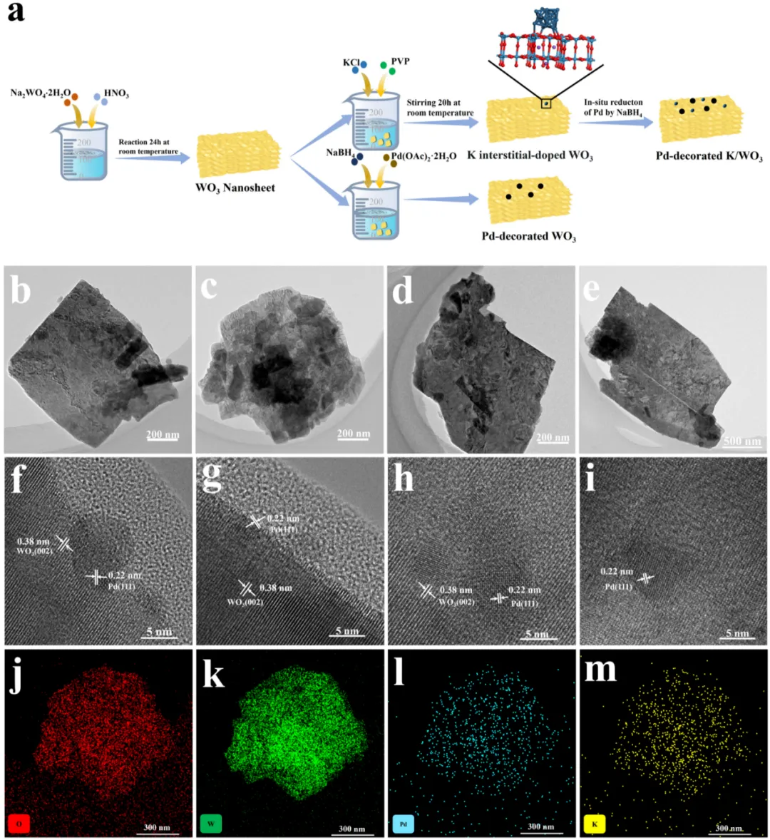 Figure 1. (a) 样品制备过程示意图,PdNP-K/WO3-15的(b-e) TEM,(f-i) HRTEM图像,(j-m)PdNP-K/WO3-15的EDS元素映射图。