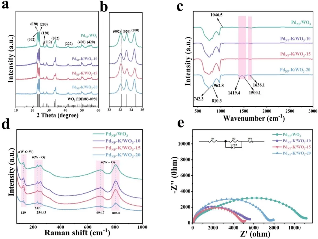 Figure 2. PdNP/WO3,PdNP-K/WO3-10,PdNP-K/WO3-15和PdNP-K/WO3-20的(a-b) XRD谱图,(c) FTIR谱图,(d) Raman谱图以及(e)电化学阻抗谱(EIS)。