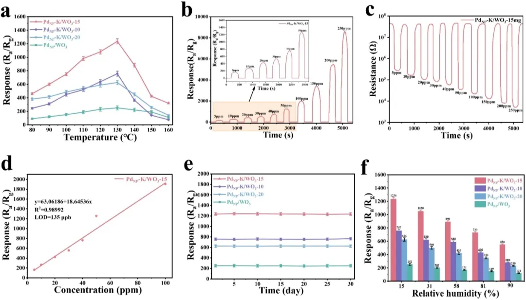 Figure 3. (a) PdNP/WO3,PdNP-K/WO3-10,PdNP-K/WO3-15和PdNP-K/WO3-20在不同工作温度下对50ppm氢气的传感响应;(b) 130℃下PdNP-K/WO3-15对不同浓度氢气(5-250 ppm)的传感响应;(c) 130℃下PdNP-K/WO3-15对不同浓度氢气(5-250 ppm)的动态响应-恢复曲线;(d) 130℃下PdNP-K/WO3-15对不同浓度氢气(5-100 ppm)的线性拟合曲线. (e) PdNP/WO3,PdNP-K/WO3-10,PdNP-K/WO3-15和PdNP-K/WO3-20在130℃下对50ppm氢气的长期稳定性(30天);(f) 130℃下PdNP/WO3,PdNP-K/WO3-10,PdNP-K/WO3-15和PdNP-K/WO3-20在不同湿度下的传感响应。