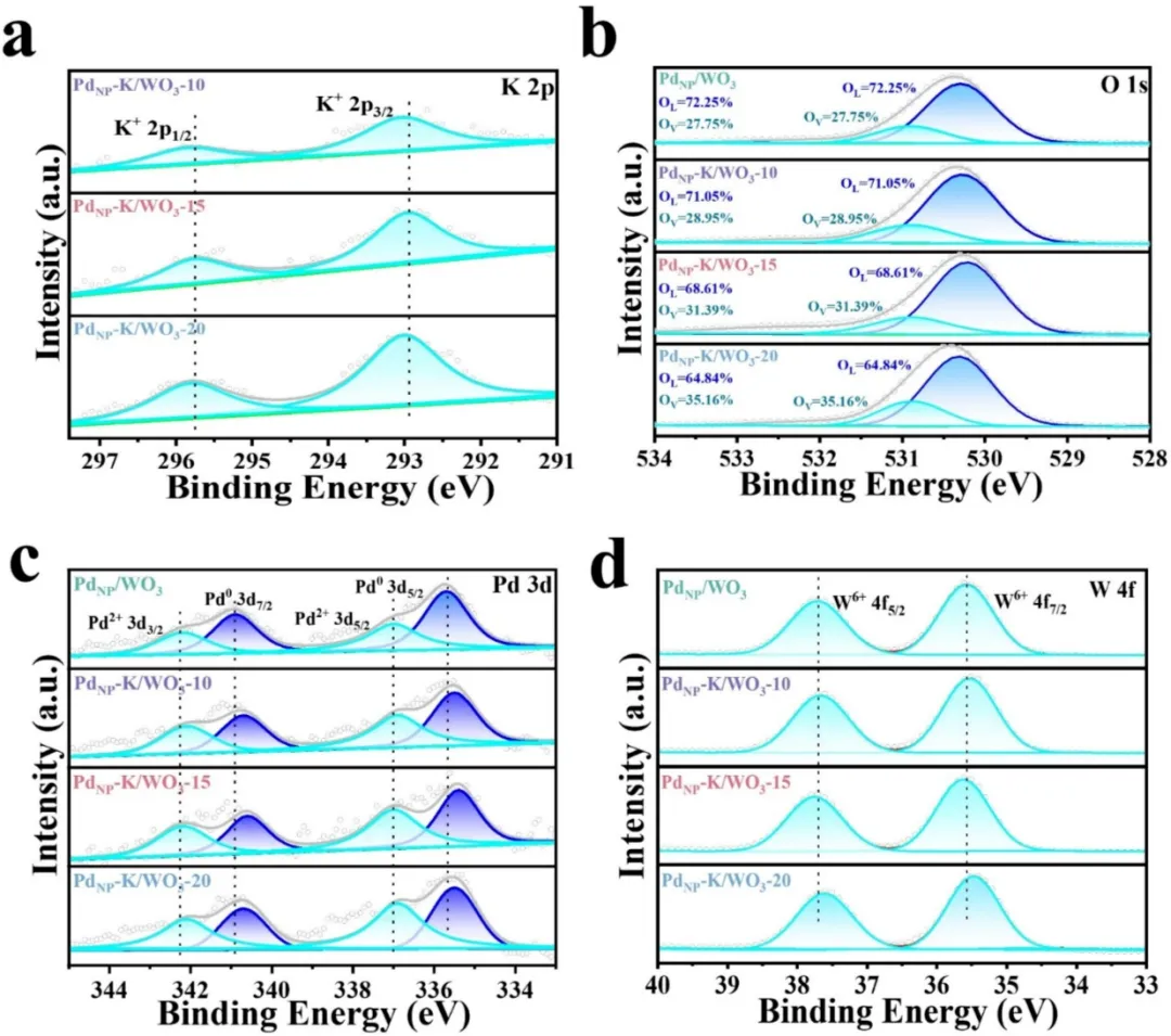 Figure 4. PdNP/WO3,PdNP-K/WO3-10,PdNP-K/WO3-15和PdNP-K/WO3-20的(a) K 2p,(b) O 1s,(c) Pd 3d,(d) W 4f 的XPS图谱。