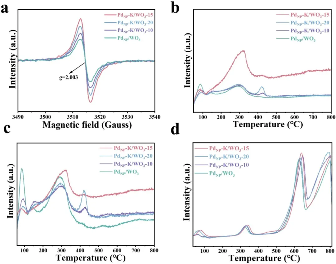 Figure 5. PdNP/WO3,PdNP-K/WO3-10,PdNP-K/WO3-15和PdNP-K/WO3-20的(a) EPR,(b) O2-TPD,(c) H2-TPD 和(d) H2-TPR图谱。