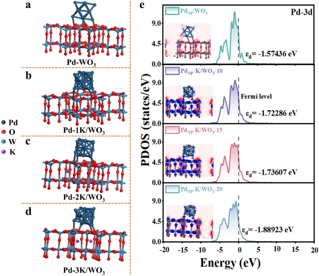 Figure 6. (a-d) PdNP/WO3,PdNP-K/WO3-10,PdNP-K/WO3-15和PdNP-K/WO3-20的简化模型,(e) 氢气吸附在PdNP/WO3,PdNP-K/WO3-10,PdNP-K/WO3-15和PdNP-K/WO3-20上的态投射密度(PDOS)。