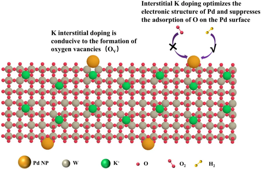 3. K+间隙掺杂使Pd的d带中心下移,弱化Pd对氧的竞争吸附、释放更多Pd活性位点,同时诱导WO3晶格畸变形成大量氧空位,降低氢迁移能垒,加速氢溢流过程与表面反应动力学。