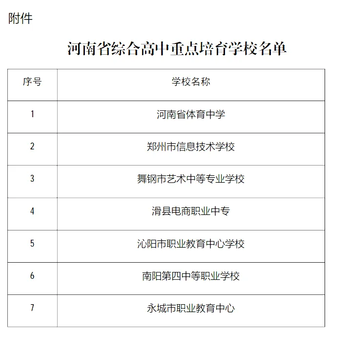 根据《河南省教育厅办公室关于推荐河南省综合高中重点培育学校的通知》(教办基〔2025〕300号)要求,经各地推荐、省级审核,确定河南体育中学等7所学校为河南省综合高中重点培育学校。现将具体名单(附后)进行公示。