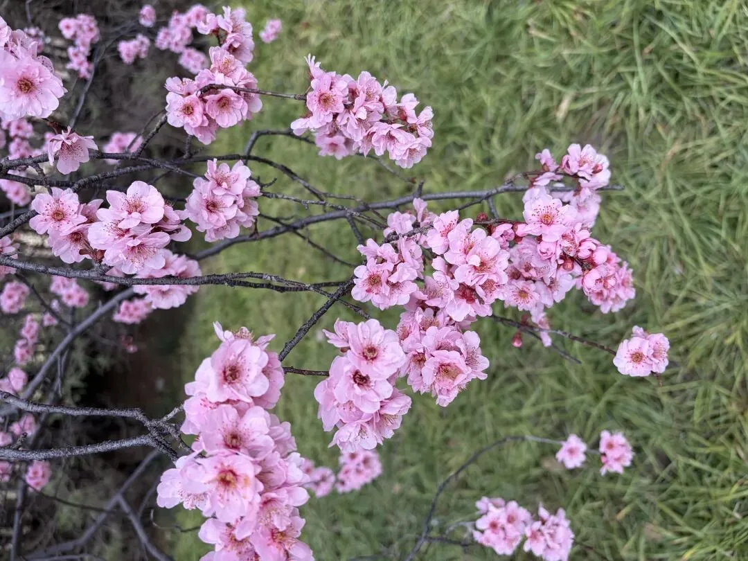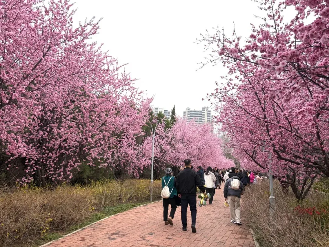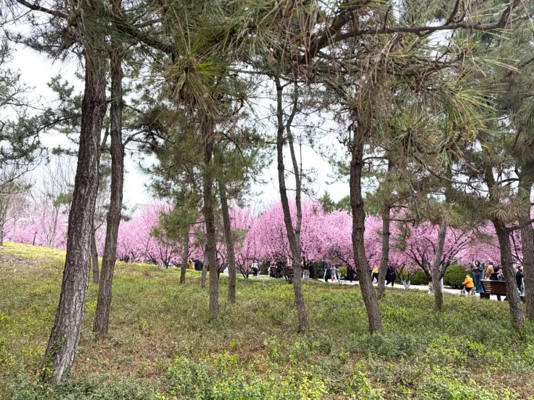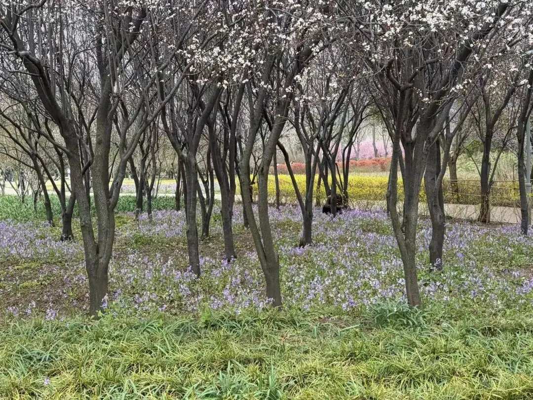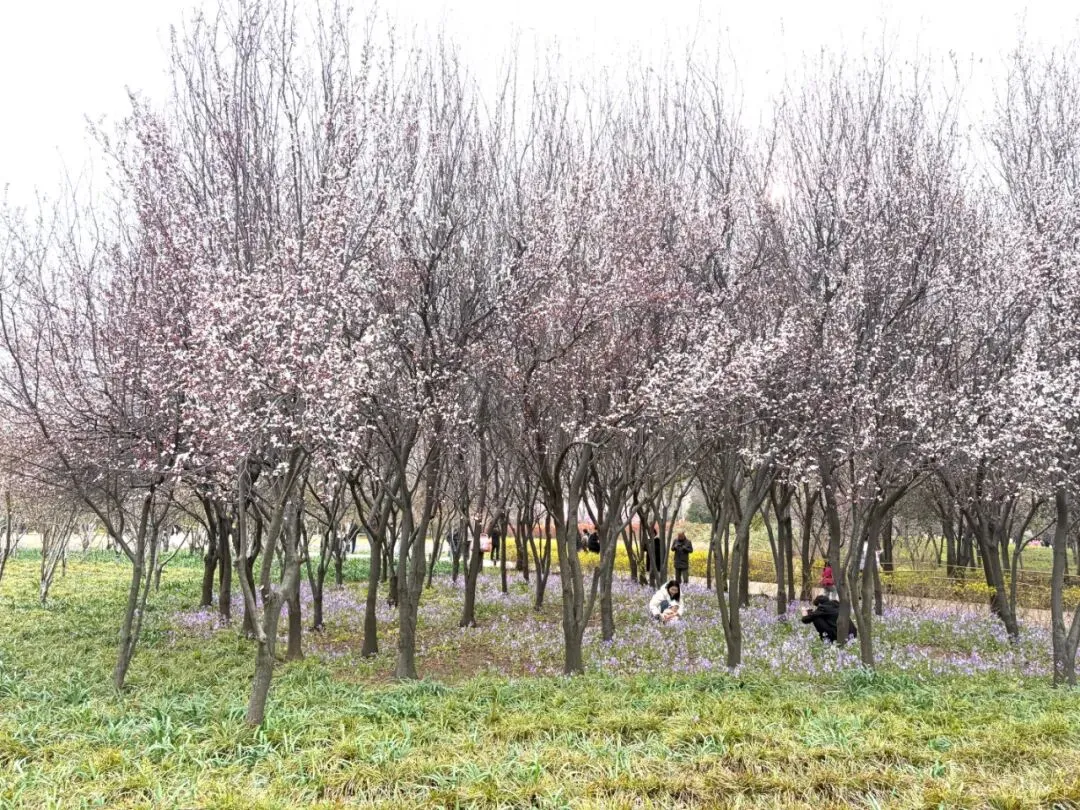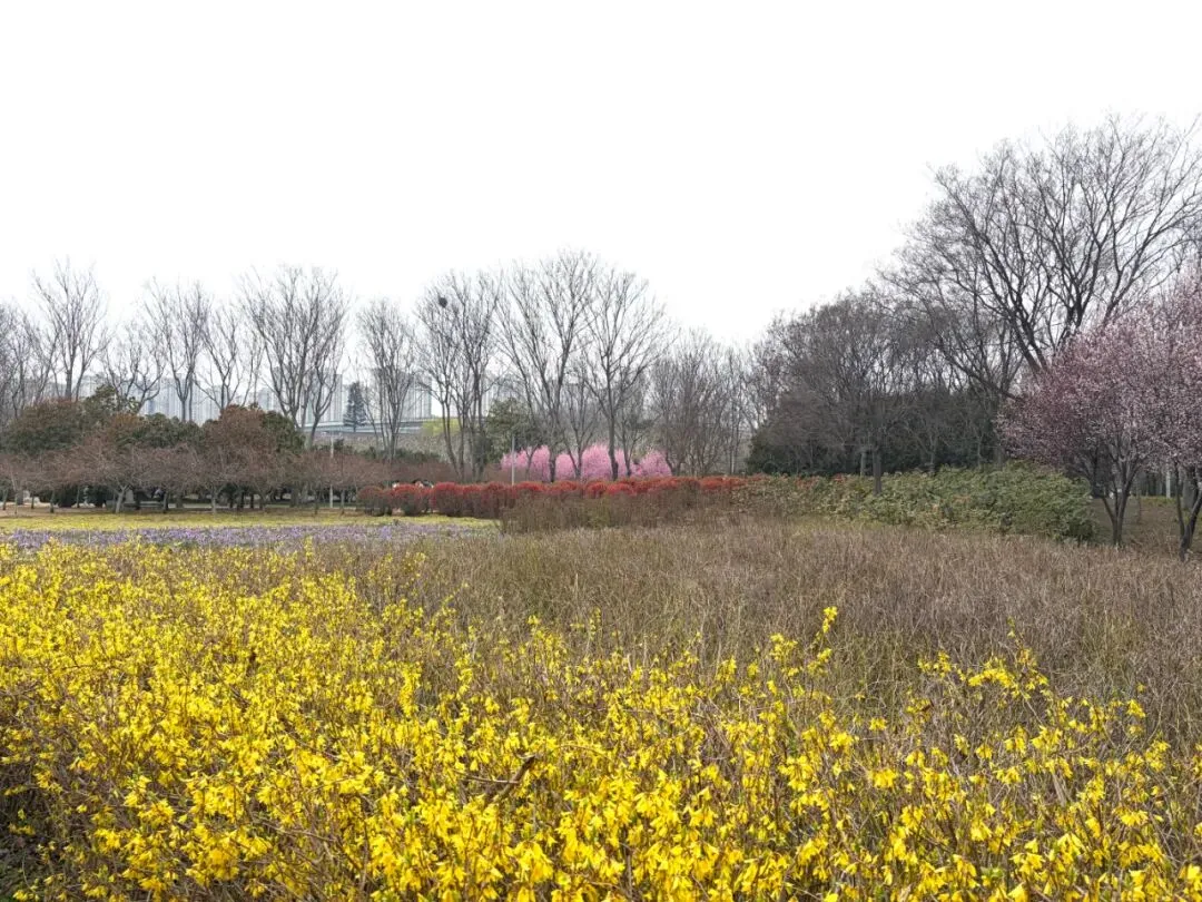 棕榈园附近貌似开了紫花地丁。绿地、紫花、黄迎春、粉色美人梅,这里望去甚有层次。