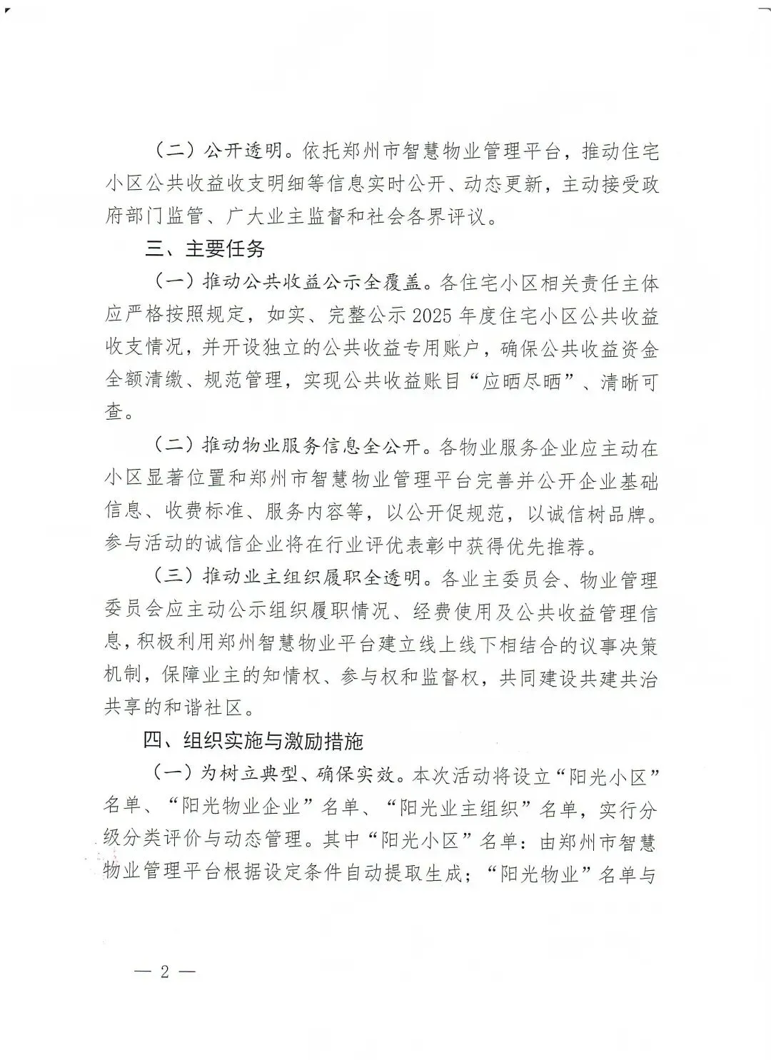 同时,活动遵循自愿参与、公开透明基本准则,依托郑州市智慧物业管理平台,实现小区公共收益、服务信息、履职情况实时公开、动态更新,主动接受政府监管、业主监督与社会评议。力争通过此次活动,在全市树立一批管理规范、服务优质、群众满意的“阳光物业”示范标杆。