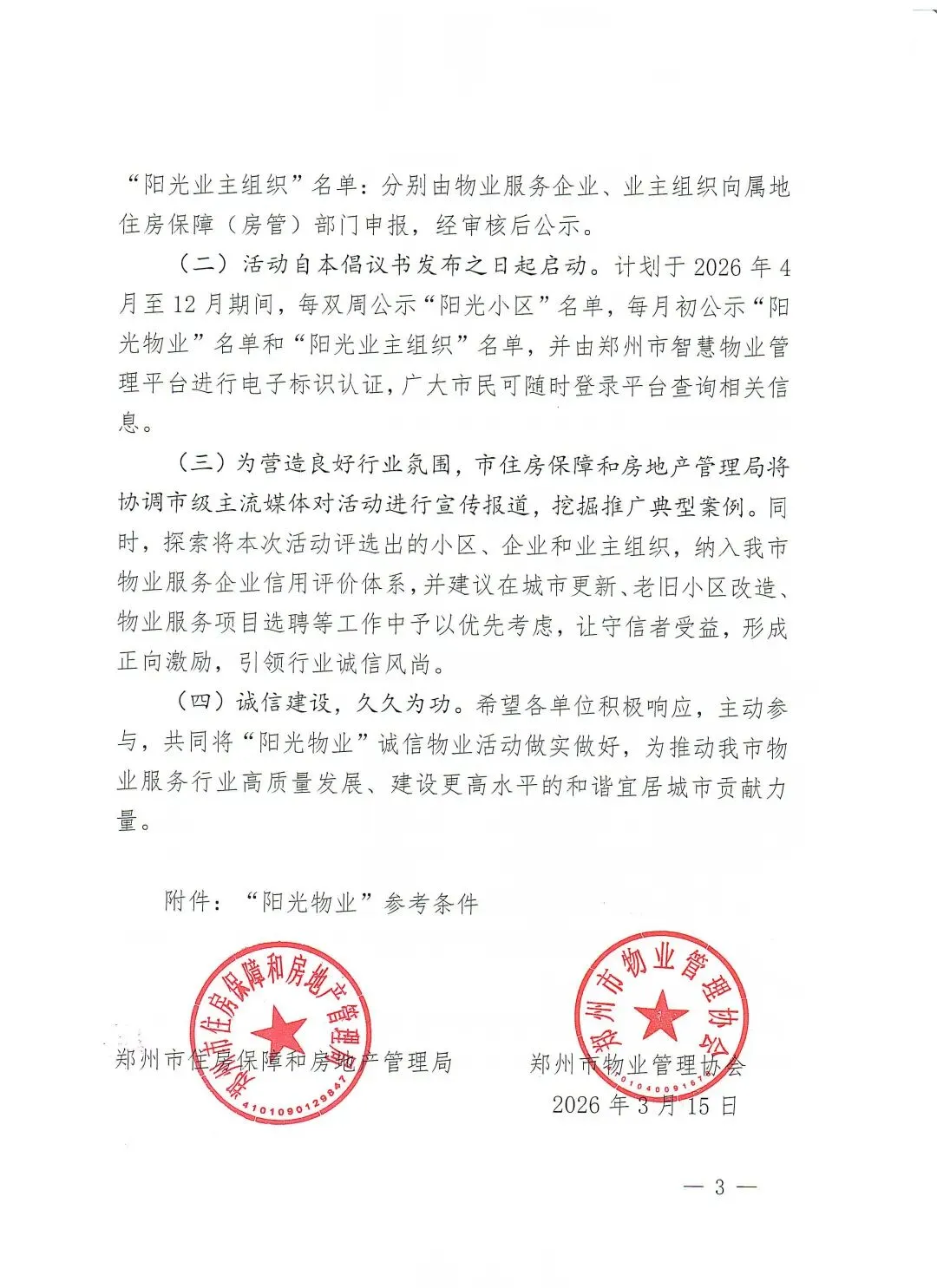 此次郑州市“阳光物业”活动自本倡议书发布之日起启动,计划于2026年4月至12月期间,每双周公示“阳光小区”名单,每月初公示“阳光物业”名单和“阳光业主组织”名单,并由郑州市智慧物业管理平台进行电子标识认证,广大市民可随时登录平台查询相关信息。