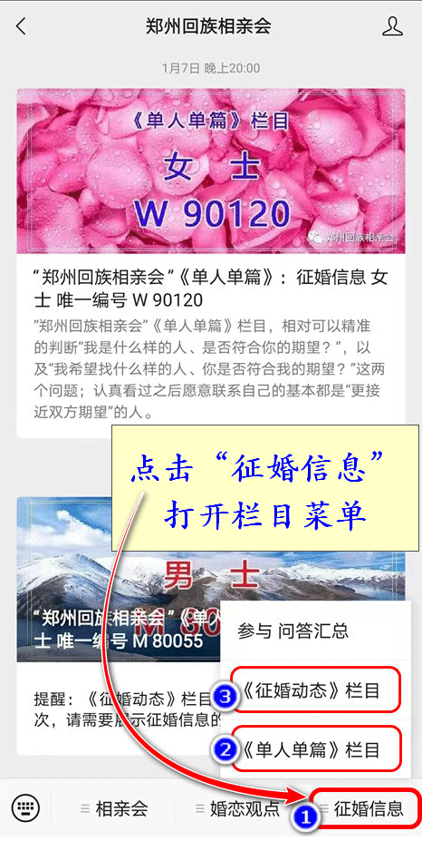 “郑州回族相亲会”官方公众号《征婚动态》栏目,男士和女士征婚信息这几天更新,请大家留意公众号更新发布的征婚信息;